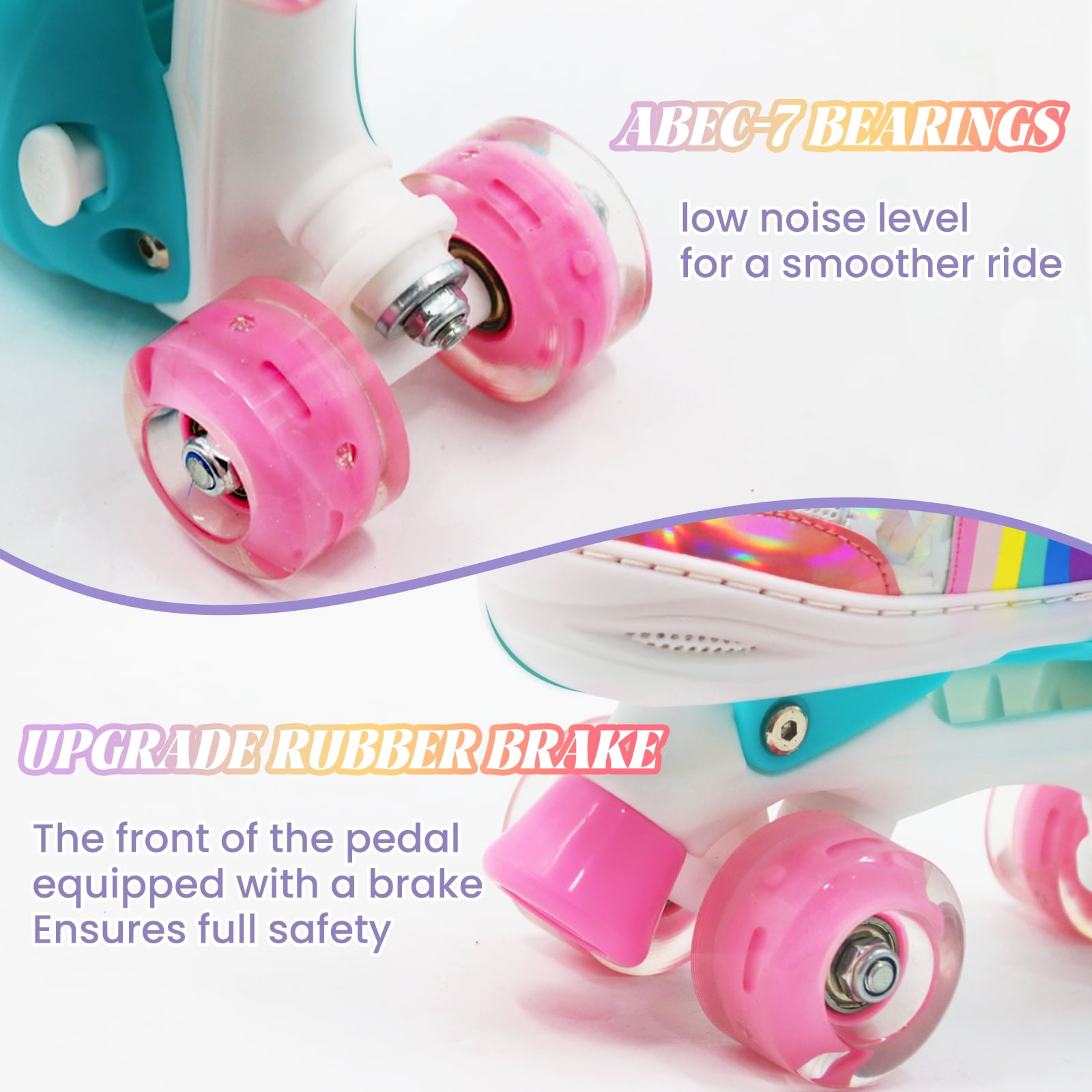 【ADJUSTABLE SIZE】-These roller skates Small fits US little kids shoe size 13C-3Y; Medium: fits US big kids shoe size 3.5Y-6Y. The kids adjustable skates size can be adjusted. Perfect for growing children. Kids can adjust by themselves easily via press of a button, and you just need to choose according to the picture size a pair of suitable girls skates. 【8 WHEELS ILLUMINATING】-All wheels with illuminating colorful lights when skating with roller skates, they are fairly cool and NO BATTERIES NEEDED! With the coolest light up wheels, make your little girl a real shining star. 【HIGH PERFORMANCE】-This skate features top quality components, including ABEC-7 full precision bearings and pure urethane wheels, that are perfect for both indoor rink use and outdoor street skating. Impact-resistant polymer plastic boot and durable PU 54mm x 32mm wheels offer added durability. 【TOTAL COMFORT】-The classic high-top sneaker style skates, features soft padded collars and lined boots to ensure your child enjoys a super comfortable and supportive fit. Safety ratchet buckle, power strap and laces up closure provide skater a safer condition when using our roller skates. 【SINCERE SERVICE】- We truly care about your customer experience and your product experience. We are 100% dedicated to your complete satisfaction. If you are not absolutely satisfied with your roller skates, and we will provide you with unconditional replacement or refund.