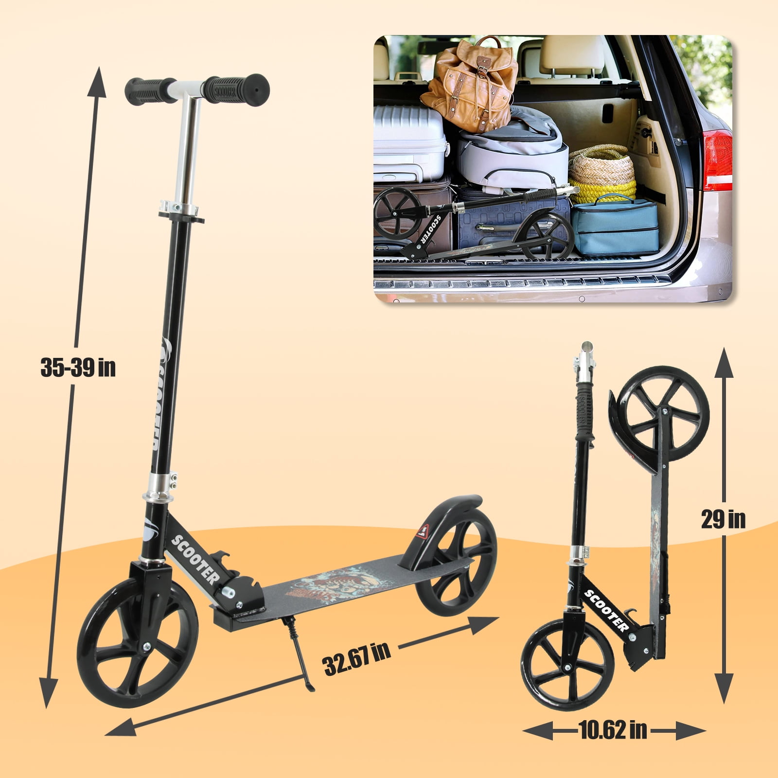 Safety features: The scooter has a rear brake function, so you only need to touch one foot to the rear wheel to stop smoothly when using it. Folding: The scooter folds up by pulling the folding button, making it compact and portable for carrying on your back or keeping in the car. Height Adjustable: The three-position adjustment function makes the scooter suitable for children from 8 years old, teenagers and adults. The three positions have a height of 35″, 37″ and 39″ respectively. Wide pedals: The pedal size is 4.6 inches * 21 inches, the wider pedal size is more stable to ride. Weight capacity is 220 lbs. The support feet are designed to make parking easier, both indoors and outdoors, without any leaning.