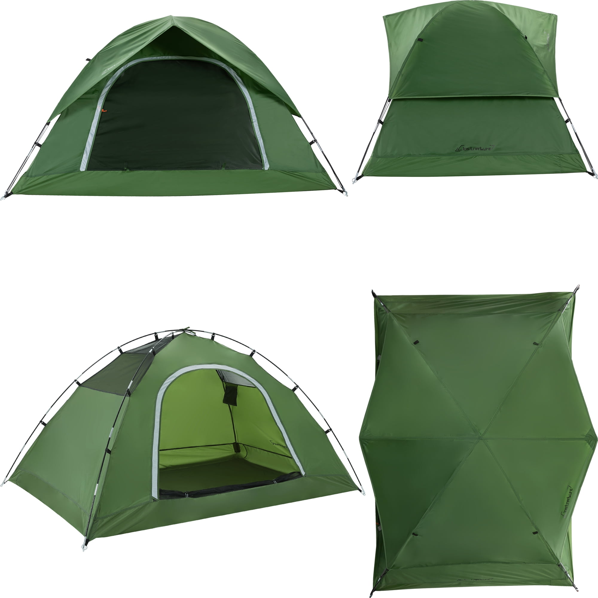 Green-2person-Glass fiber pole-Single Door EASY SETUP: Extremely simple 2-person dome tent with a freestanding design, moved and relocated without disassembling. And a classic X-pole design lets you quickly and securely attach poles while pitching this 2 man tent, takes less than 5 minutes to quickly set by 1-2 people. With fabulous structureï¼ the Tesleader 2-person ultralight backpacking tent is simpler and tougher than the pop-up tent and automatic camp tent WATERPROOF: This waterproof tent for camping applies Polyester with PU 2000 coatings. Weatherproof material with factory-sealed seams and dual-layer fabric applied to the heavy-duty camping tent corners for better security to keep you dry and comfortable. Besides, the tent’s rainfly provides fantastic protection against the elements, and you can be assured this waterproof camping tent for 2 people will remain rock steady in all seasons and all weather conditions GREAT VENTILATION: This two people tent is designed with a D-shaped net and fabric double-layer doors, better ventilation, and the net door allows you to enjoy the view outside. The mesh design on the 2 people tentâs top sides maintains fresh air goes into the tent, no more condensation worries, and gives you a romantic night of stargazing WHAT YOU GET: Inner tent, rainfly, 2x inner tent poles, rainfly pole, 8x tent stakes, 4x ropes, carry sack. This 2 person tent for camping offers a limited lifetime warranty. Instruction can be downloaded on this page