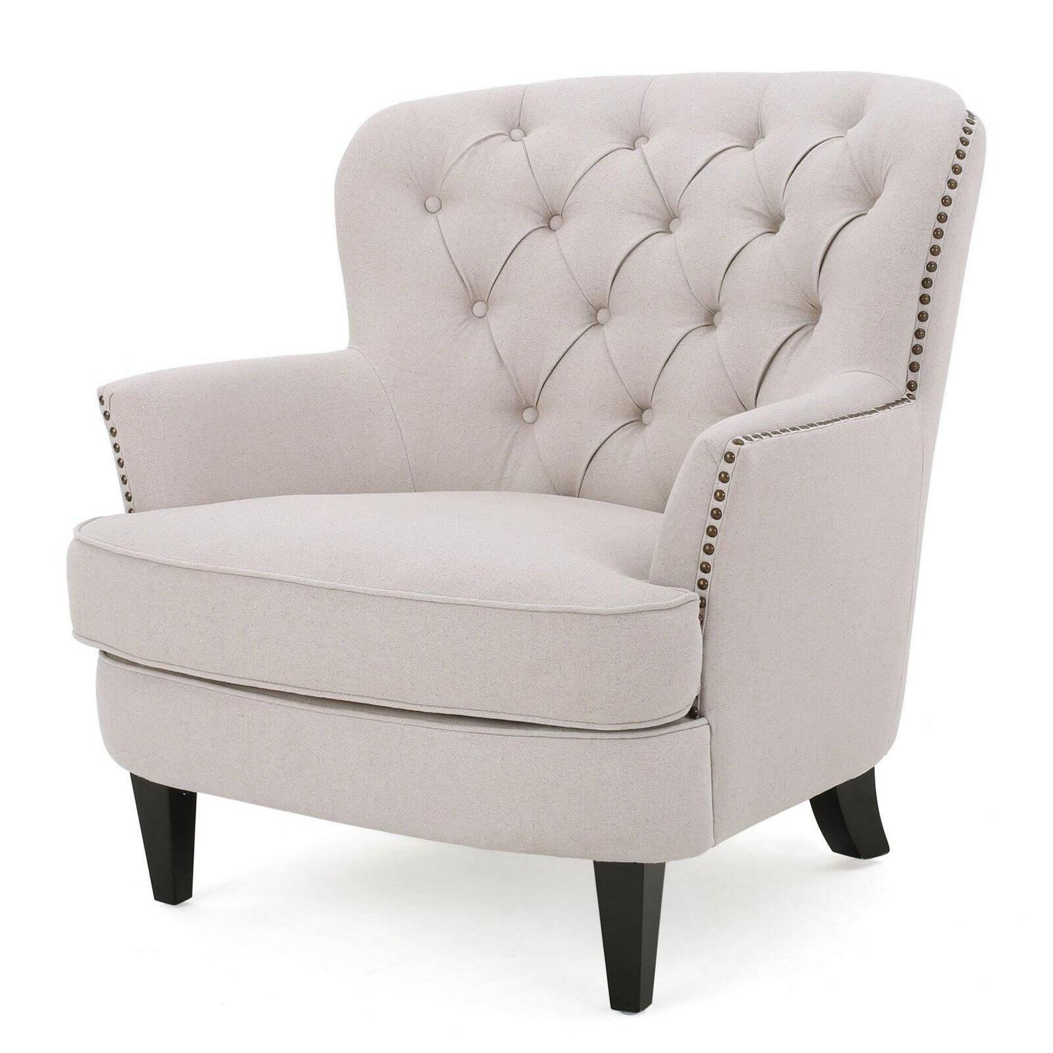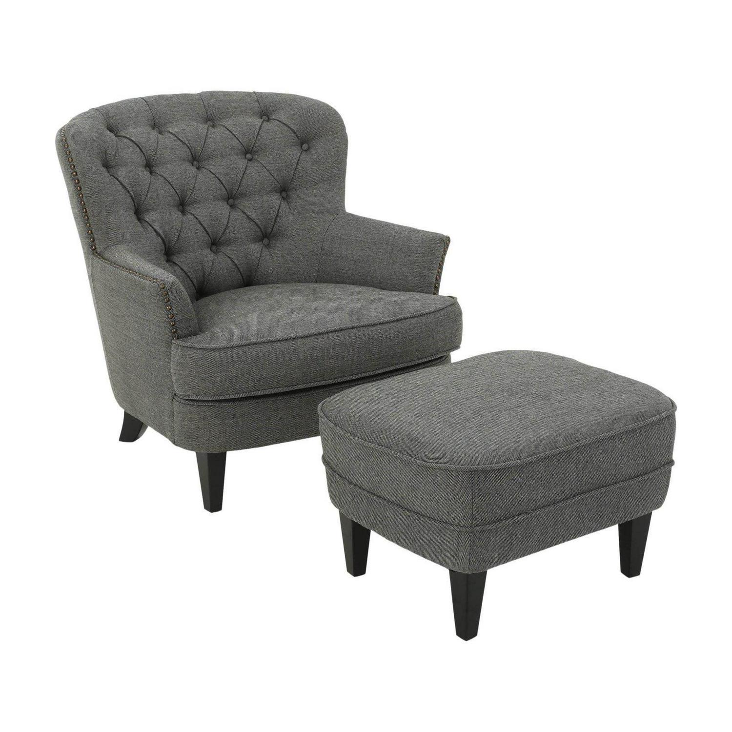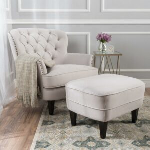 Lounge in elegant style with the Tafton Tufted Club Chair and Ottoman. The set gives you a plushly appointed club chair plus an ottoman clad in the same polyester-blend fabric. Diamond quilt button tufting and nailhead trim elevate the chair, while welted edges give the ottoman a polished appearance. Both pieces are built to last out of solid birch wood and stand on simple tapered birch legs.