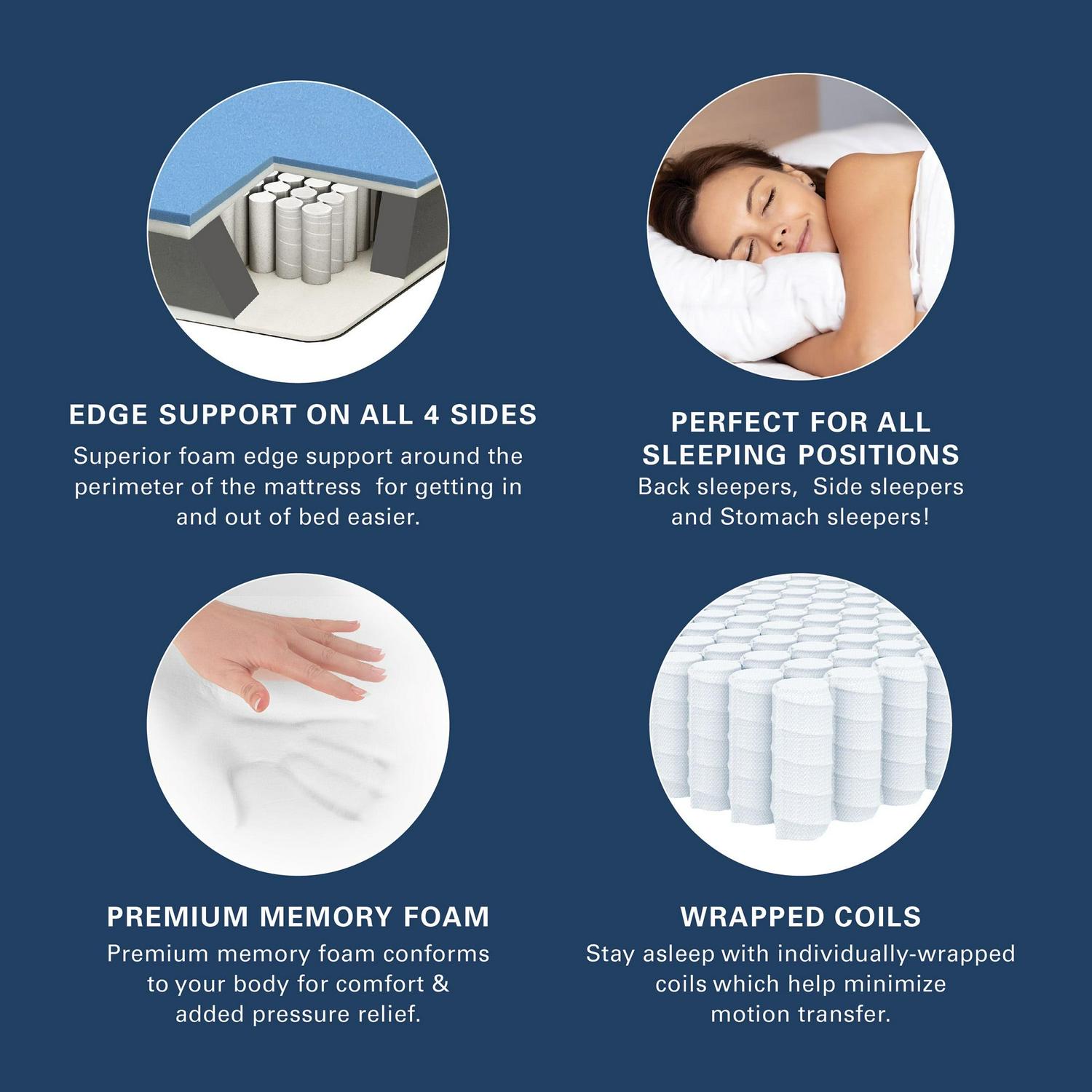 – Individually Wrapped Coils – Stay asleep with individually-wrapped coils which help minimize motion transfer. This layer includes foam edge support around the perimeter of the mattress. Edge Support Foam- Greater support around the perimeter makes it easy for you to do all the things you do in bed. High Density Base Foam Final foam layer for added stability. Bed in a Box – Mattress arrives rolled and compressed for easy delivery and set up.