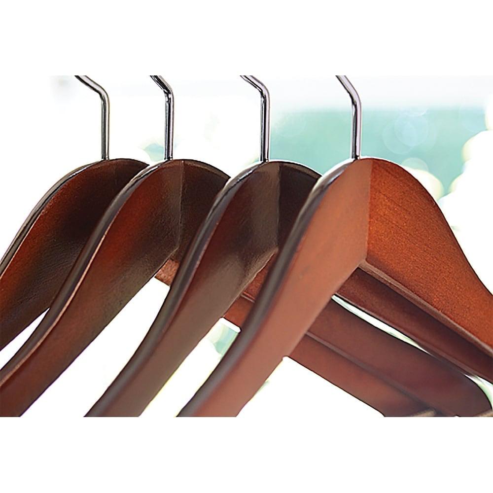 These sturdy, elegant coat hangers are crafted with impeccable hardwood and multiple coatings of lacquer to prevent splintering