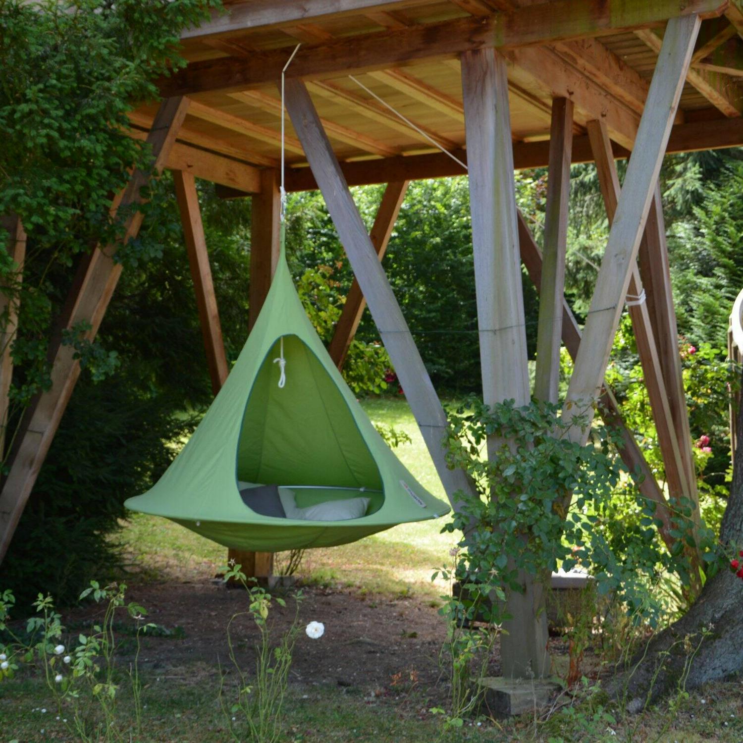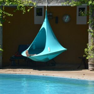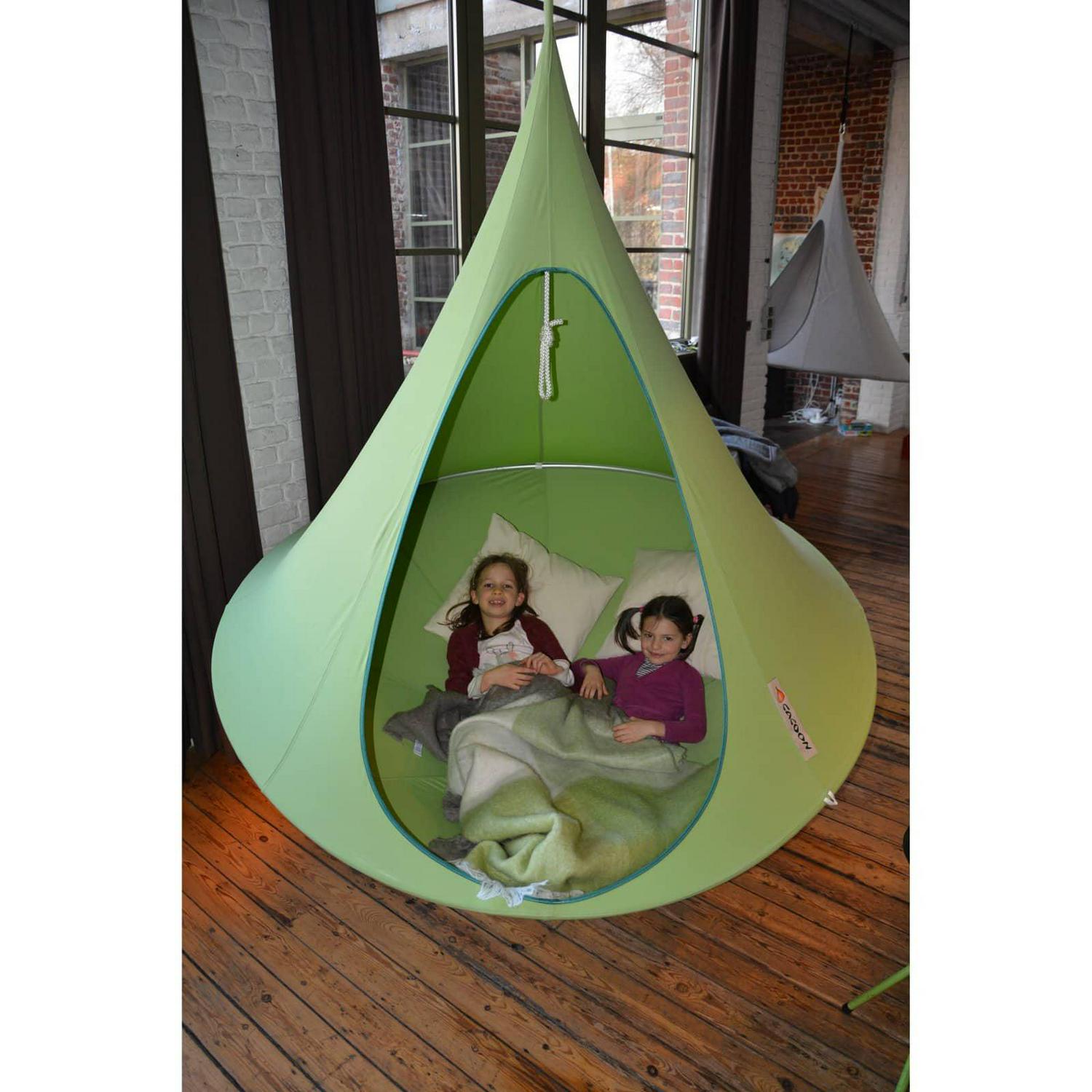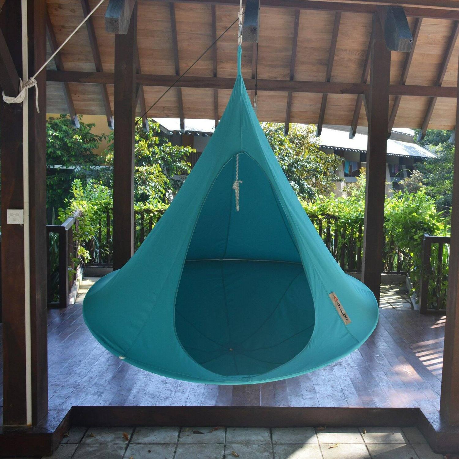 This green two person cacoon chair is perfect for relaxing from the stresses of the day inside or outside. Hang from a tree or from the ceiling in your home for a quick and easy way to relax. Read a book, take a nap or drink a cup of coffee in this chair today!. Features: Two person green hanging cacoon chair. Fits two people . Comes with a bag for easy storage . For hanging chair comes with a nylon hanging system and a carabiner. Maximum weight capacity is 440lbs . Can be used indoors or outdoors. Dimensions: 72 H X 72 W x 72 L. Material(s): polyester, cotton