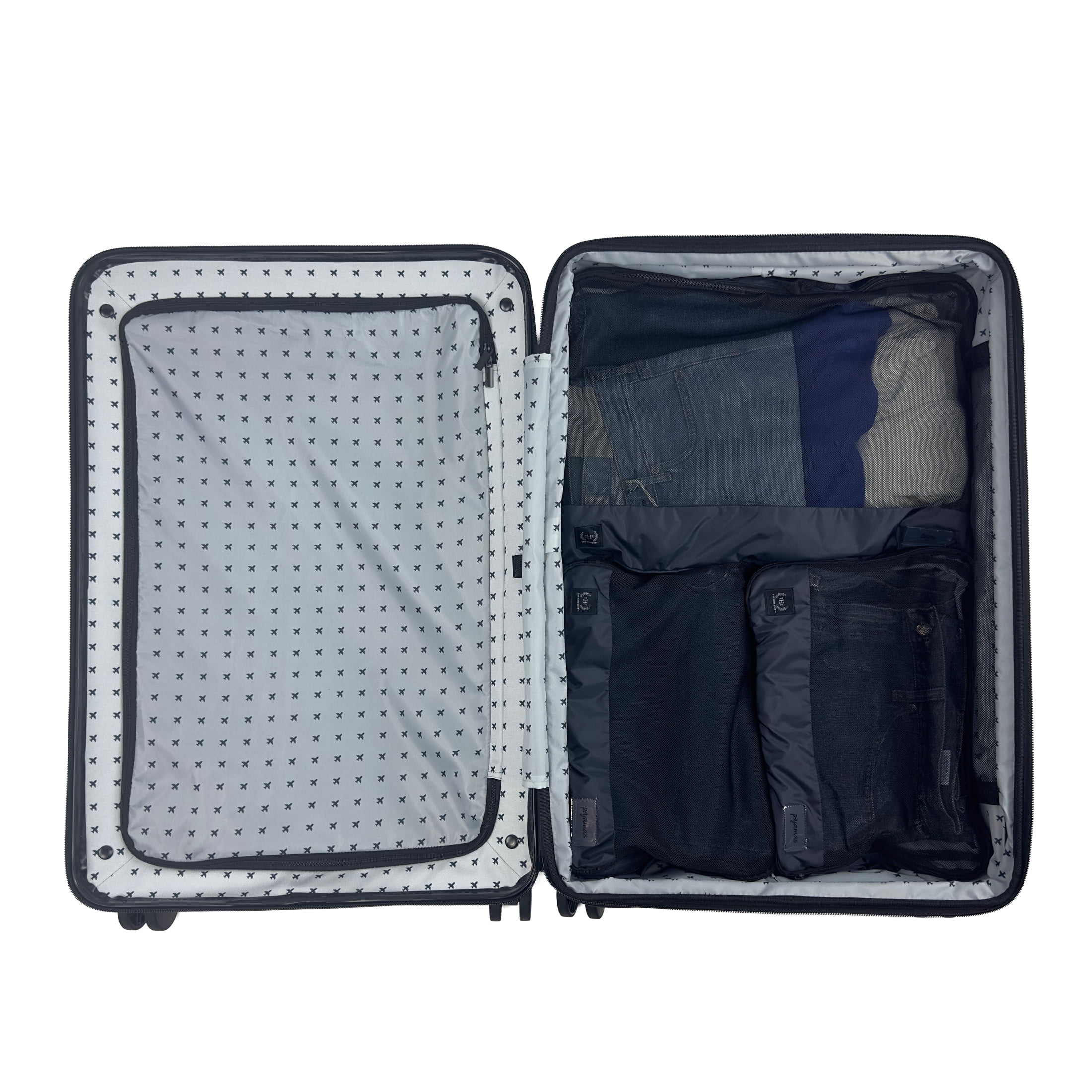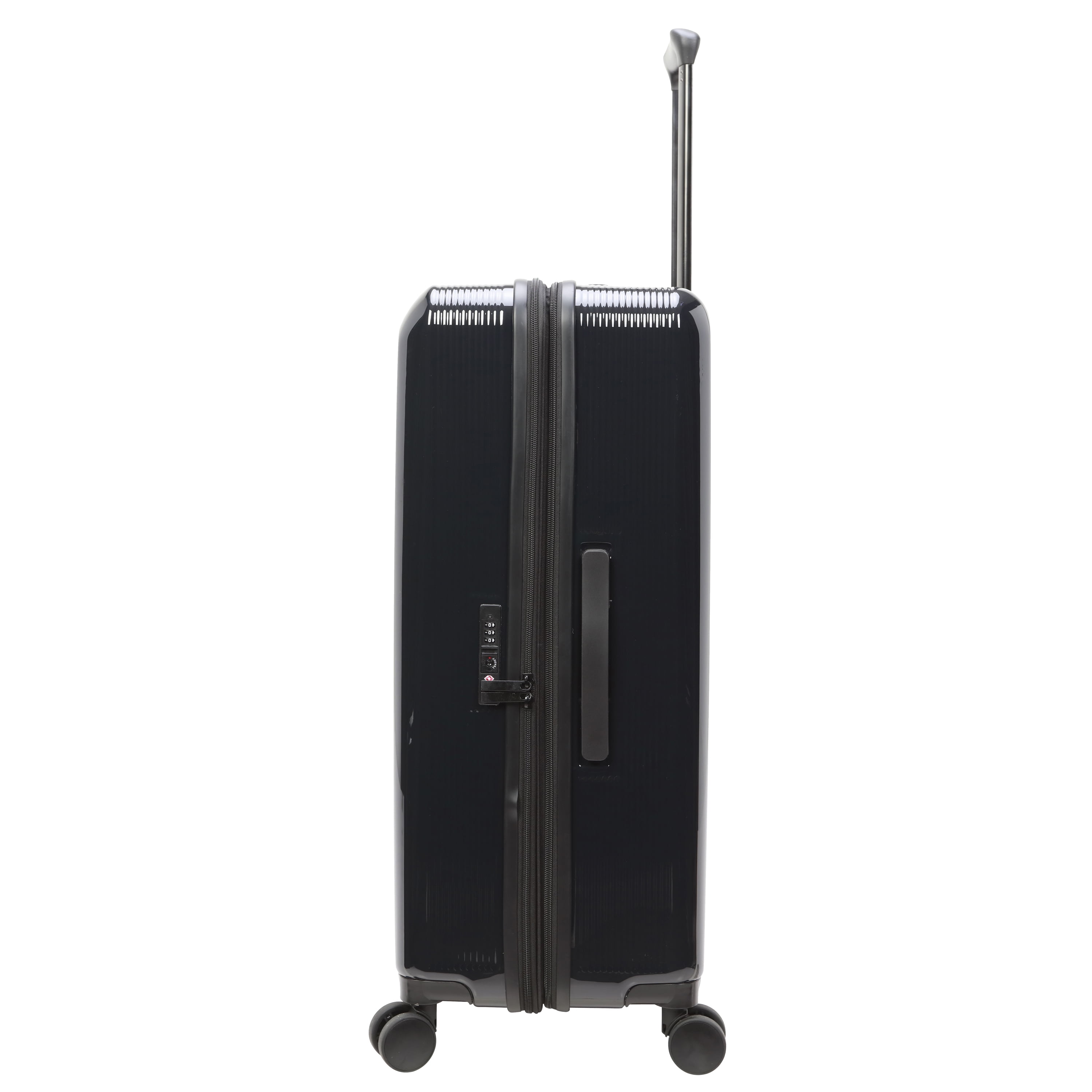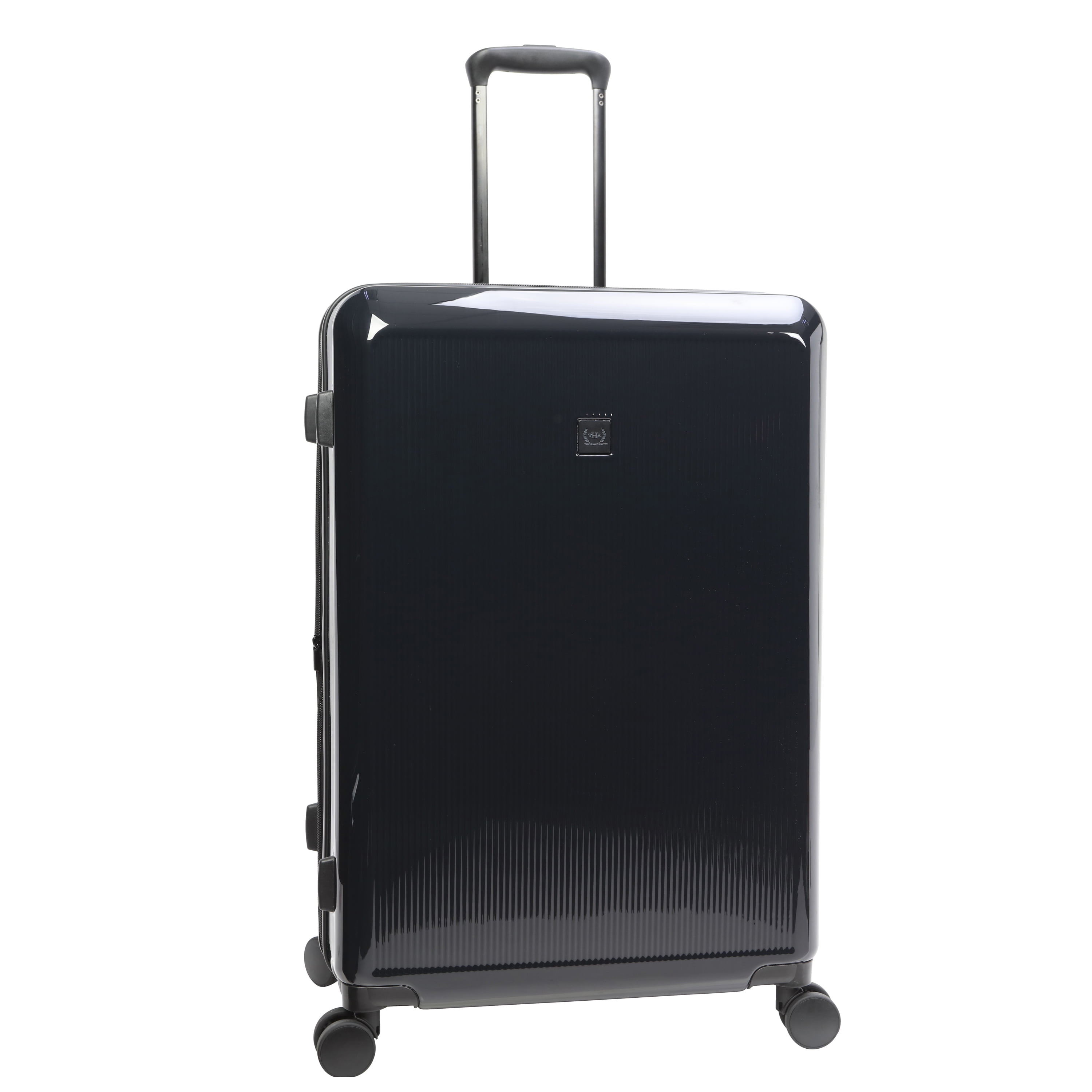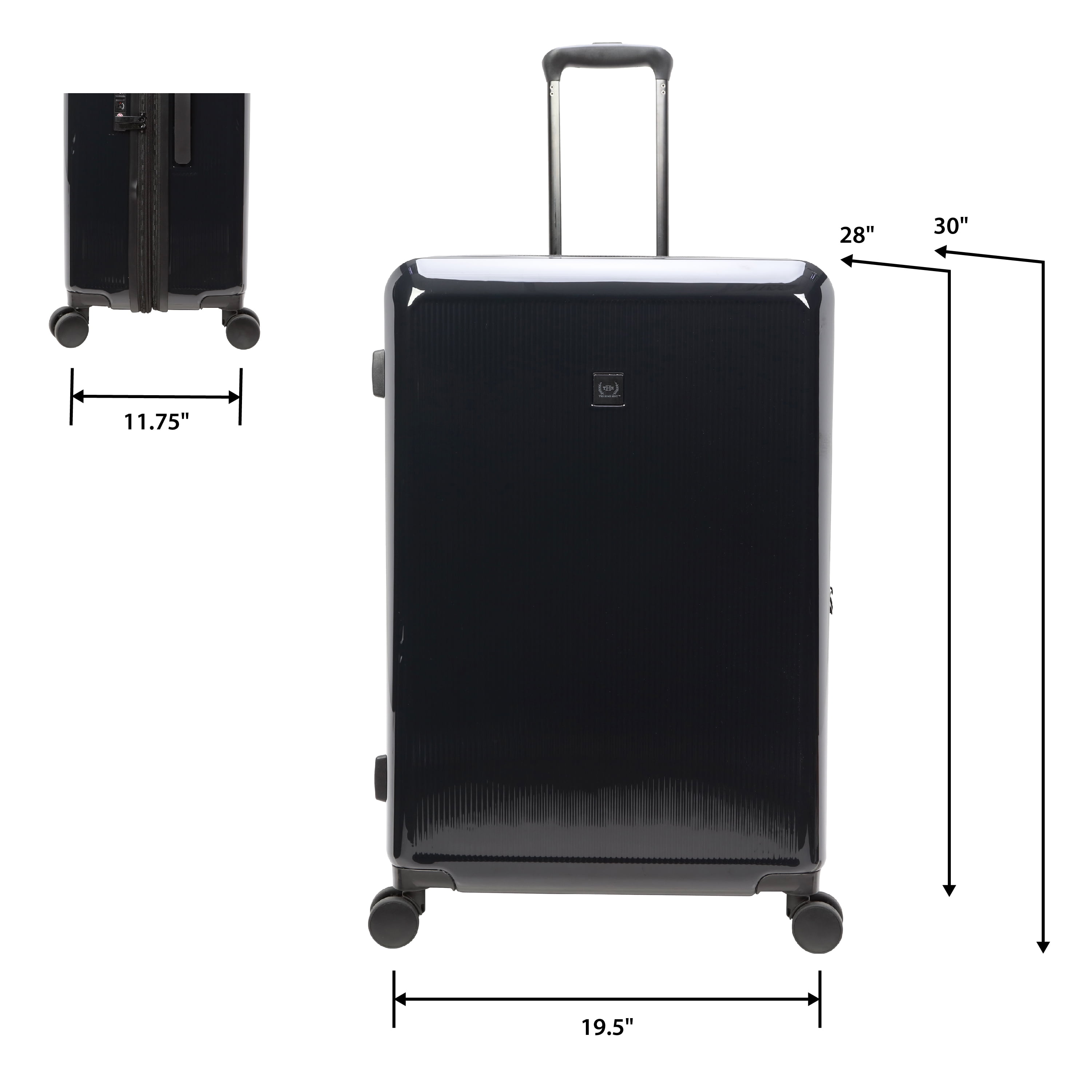 The Home Edit 28″ Checked Luggage in 4 colorways – Black, Green, Navy and Lavender Removable interior duffel for extra storage Dimensions: Body 28″ H x 19.50″ W x 1175″ D With Wheels 30.50″ H x 19.50″ W x 11.75″ D and weight 11.4 lbs. ABS Hardsided outer shell Polyester fabric lining TSA lock for security purposes Main roomy compartment Inside wet pocket and mesh pocket Compression straps for holding clothing in place during travel 360 degree spinner wheels Matching metal hardware Top and side carry handles and telescopic adjustable handle
