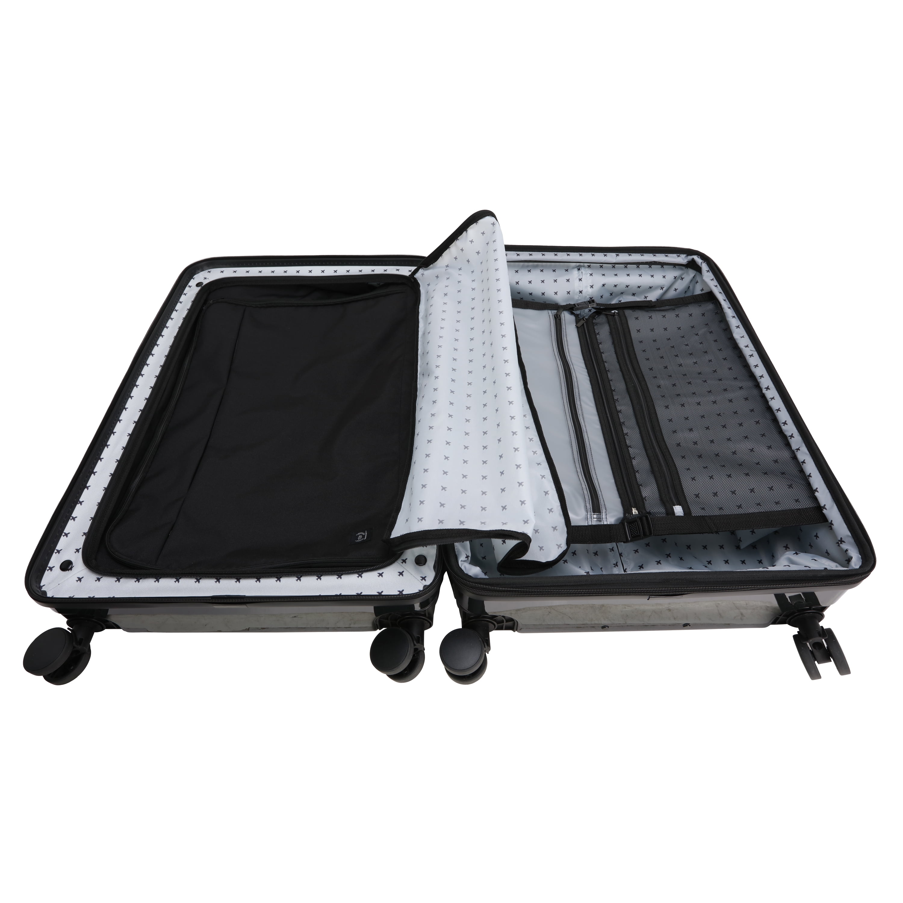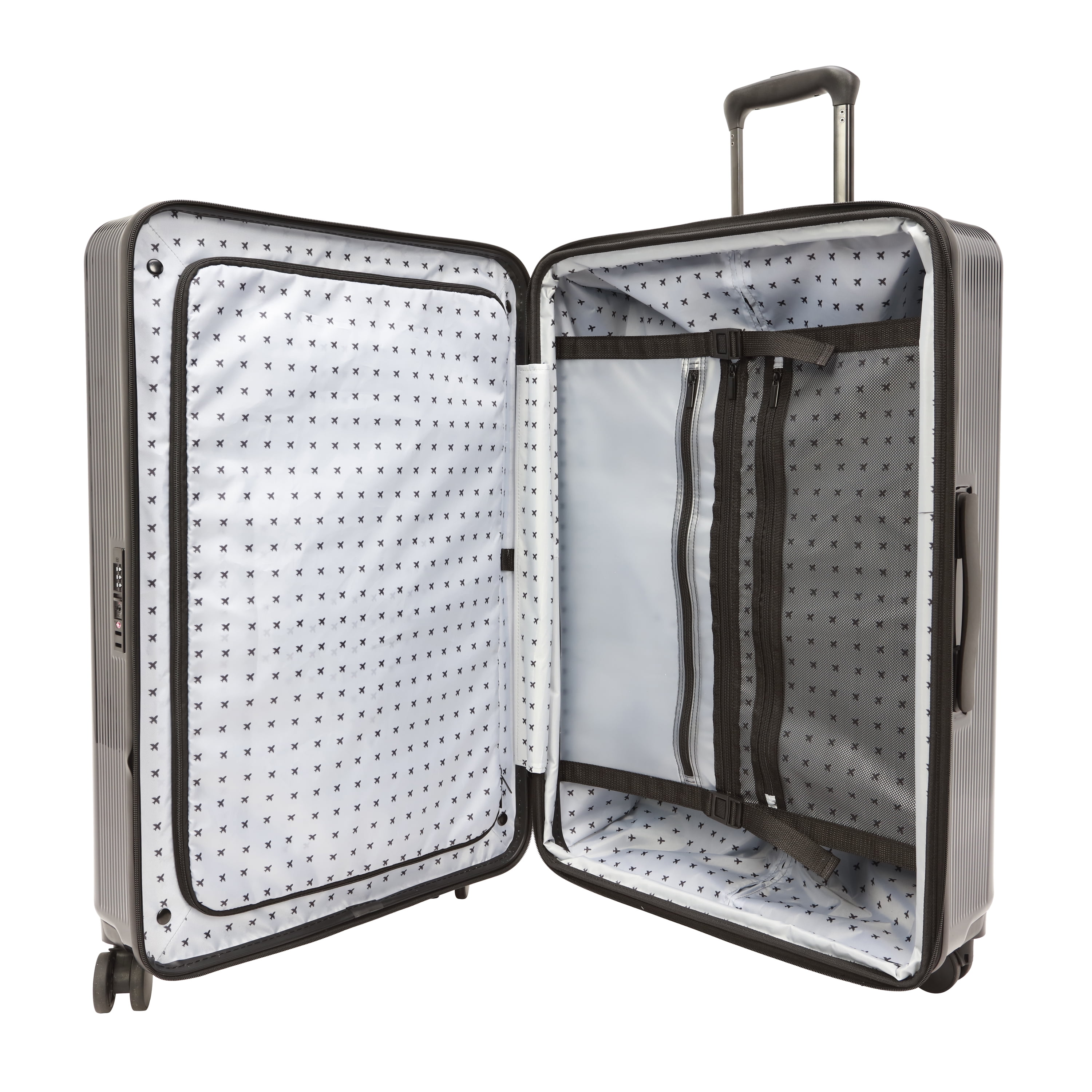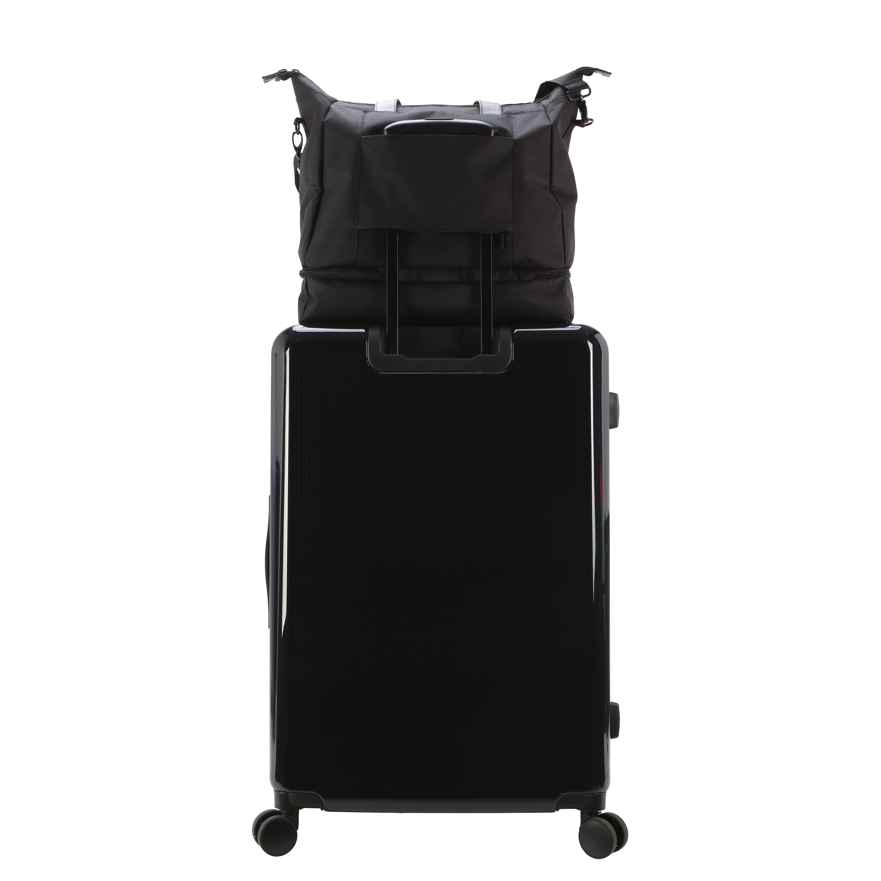 Room to Grow! Enjoy flexibility on the go with our 28-inch checked luggage in tow. Featuring 360-degree spin wheels, compression straps, and a removable duffel bag that blends seamlessly into the interior lining for extra cargo. This suitcase is perfect for the traveler who shops everywhere they stop. Available in black, green, navy and lavender in 2 sizes, 28-inch checked and 21-inch carry-on size exclusively at .