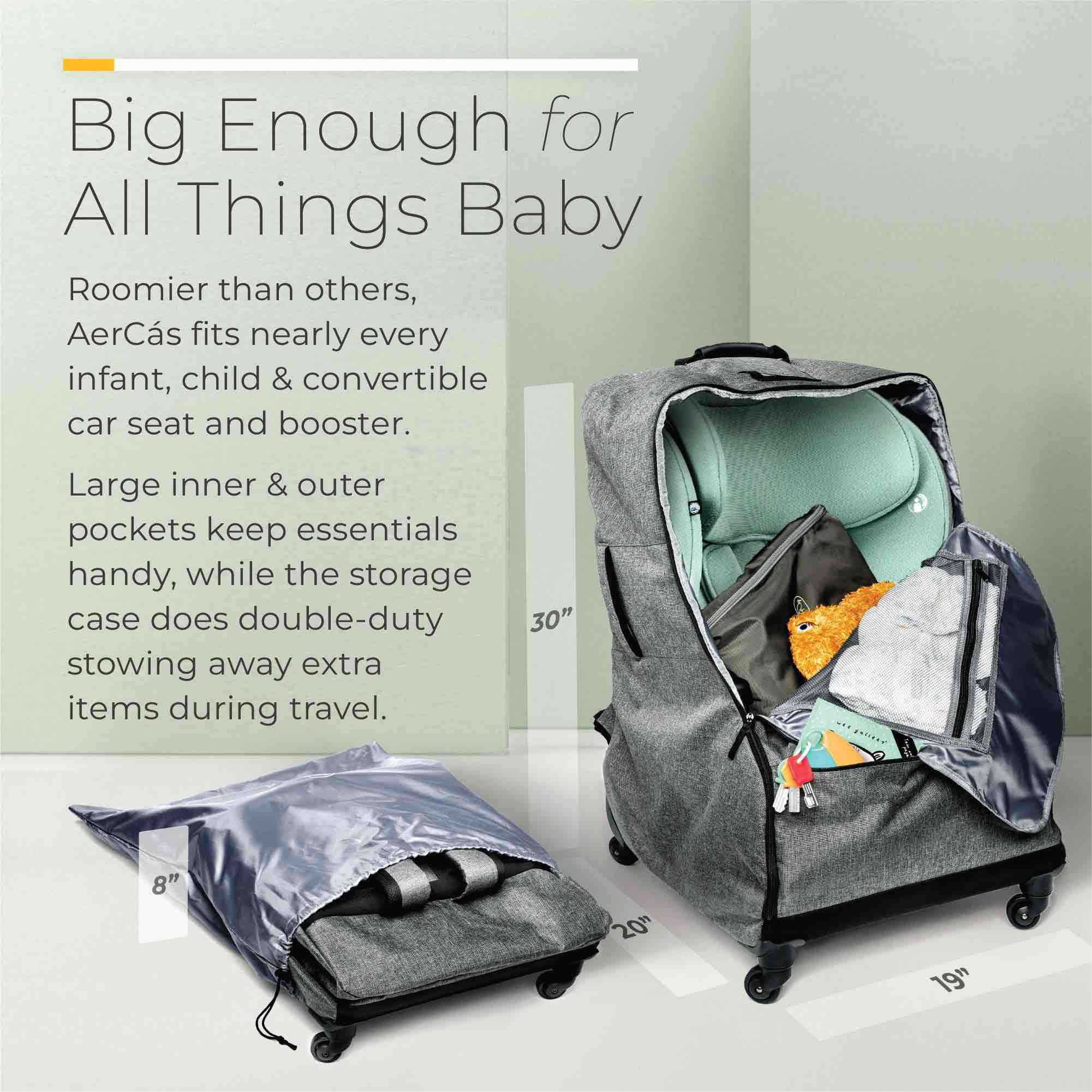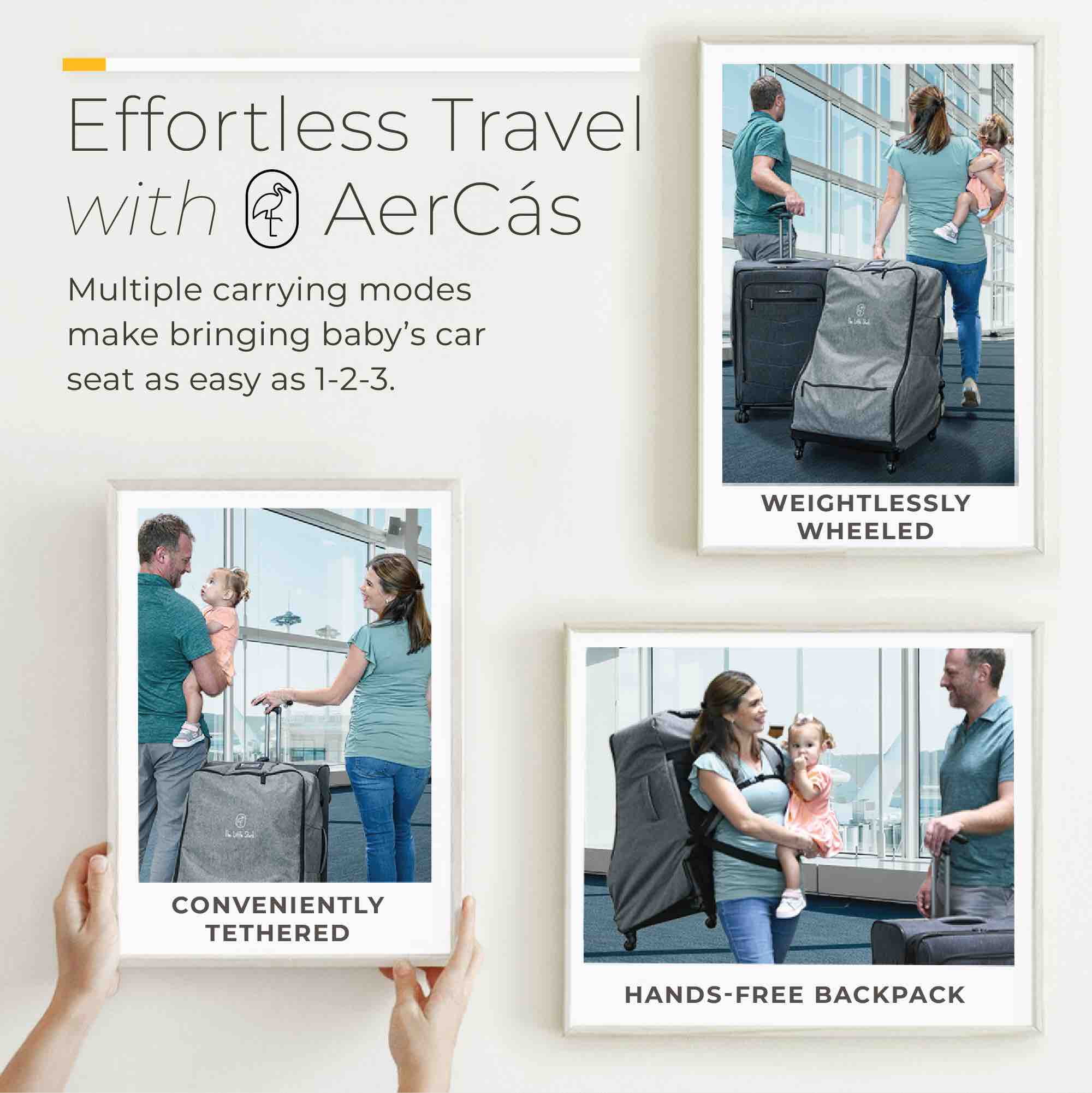Overview: The Little Stork Car Seat Wheeled Padded Travel Backpack AerCas Bag has your cleaner journey covered. Traveling with a little person can be challenging. Our 3-in-1 AerCas is a car seat carrier that can be rolled like a suitcase, worn as a backpack, or attached to luggage with the included strap. Our ergonomic, padded backpack straps are adjustable for comfortable wear. Also included are movable waist and chest straps. The gray AerCas bag has 360 degree, no wobble plastic wheels which make navigating the airport much easier with a small child. The travel car seat bag system has a fully opening, zippered front panel for efficient loading and unloading prior to Gate check. Our backpack cover is made of triple layer 900D polyester fabric that is waterproof and tear-resistant. The sturdy polycarbonate base has curb-proof corners for durability and lasting use. The Little Stork 3-in-1 universal carrier has lockable metal dual-zippers, an ID window, and includes an extra drawstring storage bag for when the travel case is not in use. Our U.S.A based, family-owned, small business is proud to support your family with our modern stylish and strong gate check 3-in-1 AerCas wheeled travel bag while giving back to ALSAC/St.Jude. Travel well with The Little Stork.