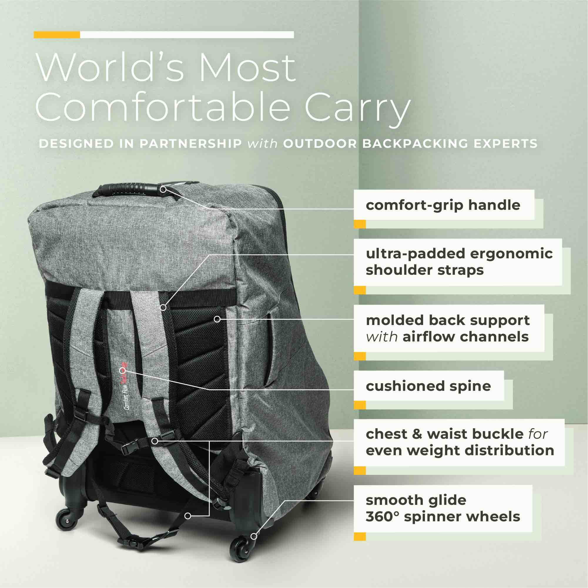 Waterproof and durable 900D polyester gray fabric with 360 degree plastic wheels Ergonomically-designed, extra long padded backpack straps Easy load metal, dual-zippered front opening with ID window Bag has double reinforced seams at all stress points Strong front and side handles for comfortable transport Dimensions are 20 x 19 x 30 Hand wipe clean mild soap and water. Dry well Functions in wheeled, backpack, and tethered mode Extra storage bag to enclose 3-in-1 travel carrier system when not in use Protects universal car seats from damage and germs when not in use U.S.A. based family-owned, small business and customer support