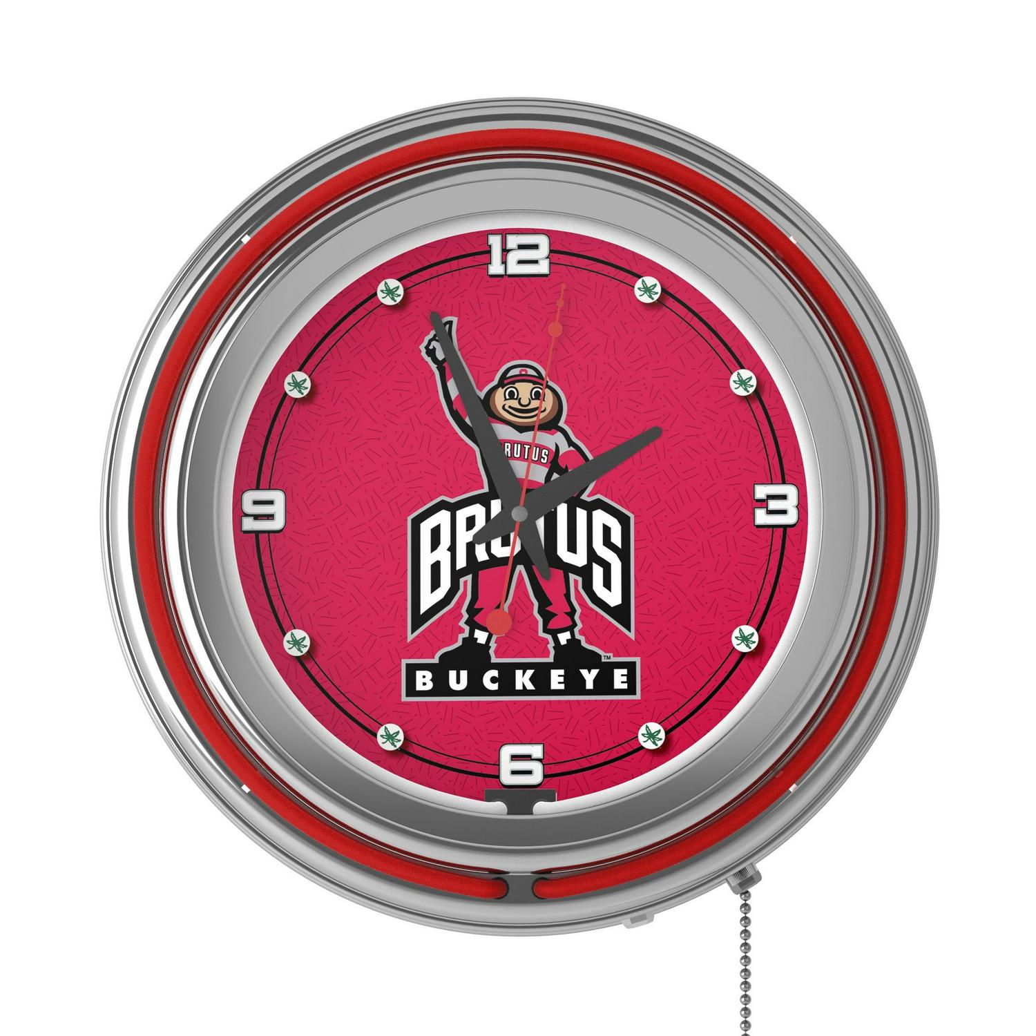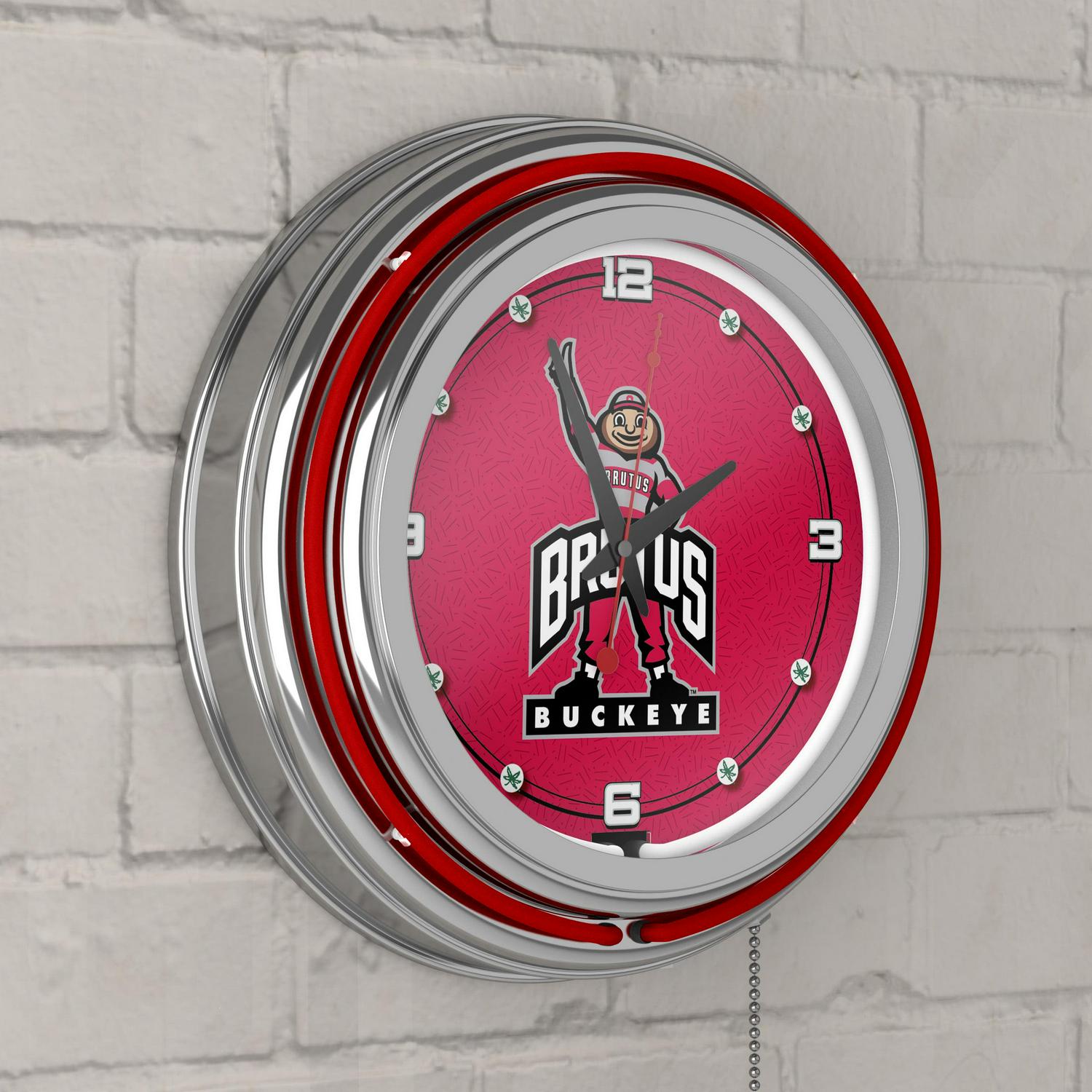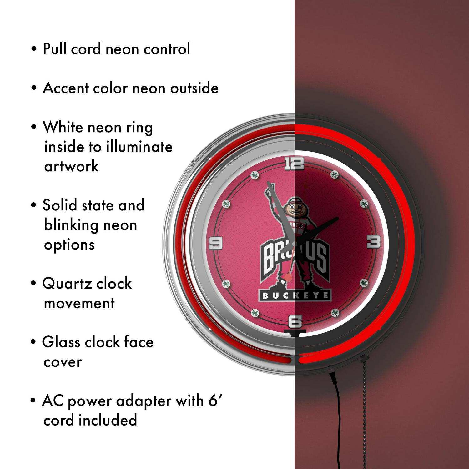 This officially licensed Neon Wall Clock is the perfect addition to any game room, garage or man cave. This impressive clock has two neon rings; one is an accent colored neon ring on the exterior and the other is a brilliant white neon ring on the interior of the clock to light up your favorite logo. Other highlights include chrome finished resin housing and a high-grade glass clock face cover. The battery-operated quartz clock mechanism will keep it ticking for a long time, while the neon runs off the included AC adapter. The neon is controlled by the pull chain and the back of the clock includes a wall hanging mount and has two modes solid state and blinking. The 3 depth of this clock combined with the radiant shimmer of the neon reflecting off the chrome housing is sure to make this clock pop on any wall!