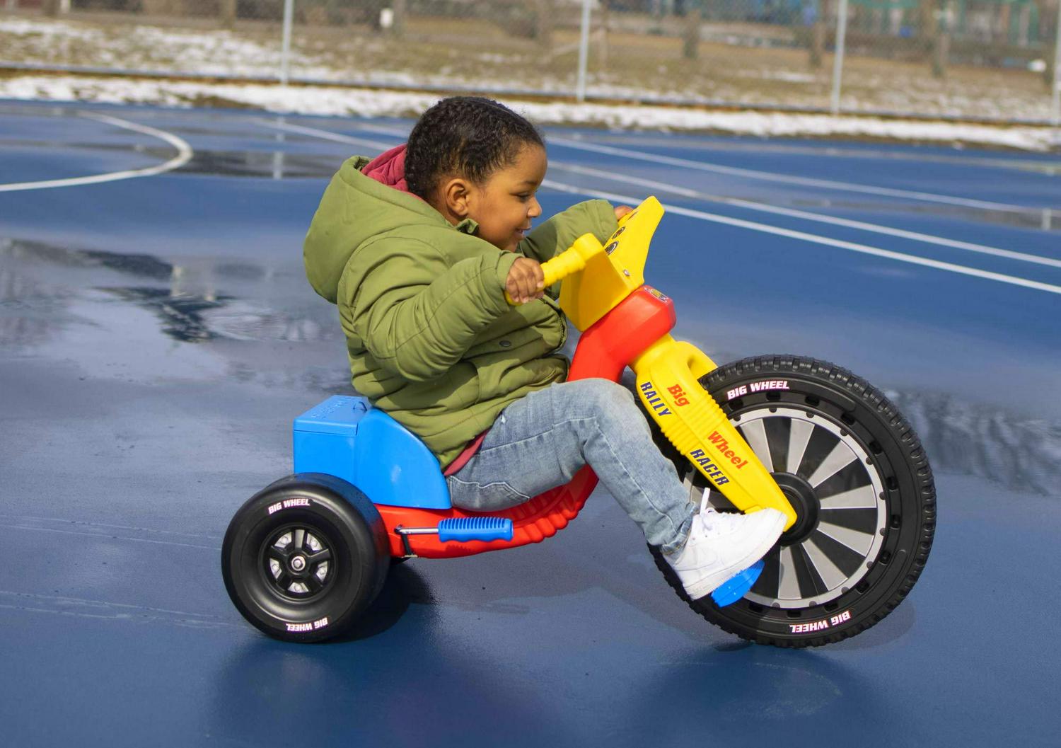 For countless years Big Wheel has been a kids favorite way to get around! With the newest iteration Rally Racer for children 3-8 years old. Kid will have a blast drifting with its real working hand break system made for some epic fun! This tricycle delivers a safe and fun riding experience due to its low center of gravity and its extra wide wheels. It features a large 16 front wheel to hug the road and allow for a safe take off without slipping.