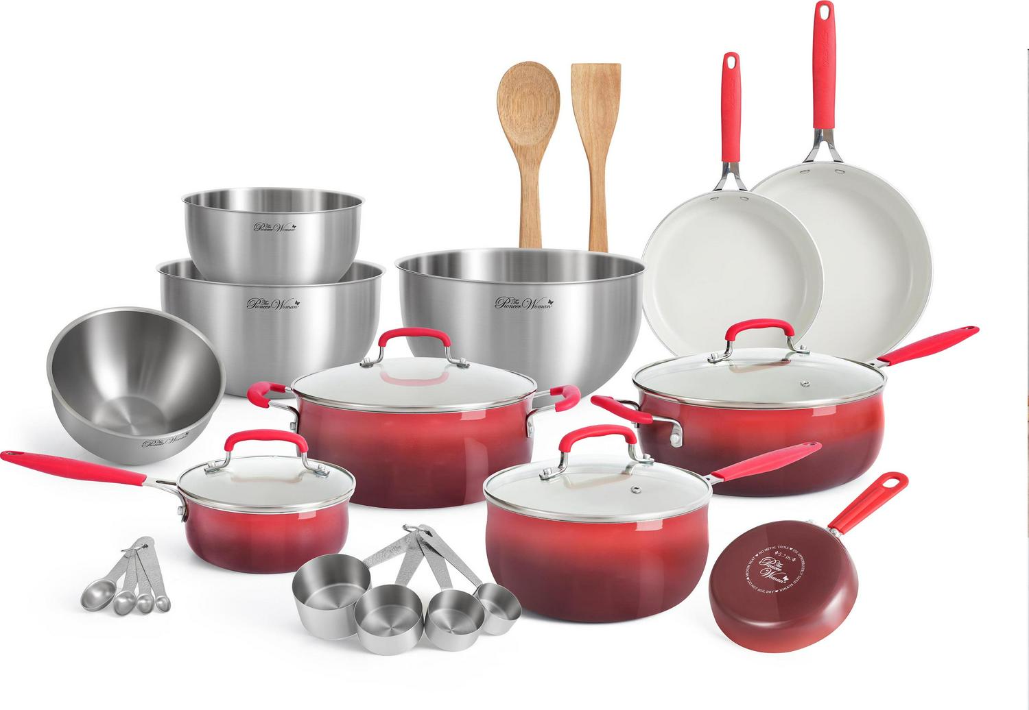 - The Pioneer Woman 25 Piece Ceramic Nonstick Aluminum Cookware Set, Ombre Red