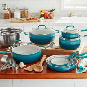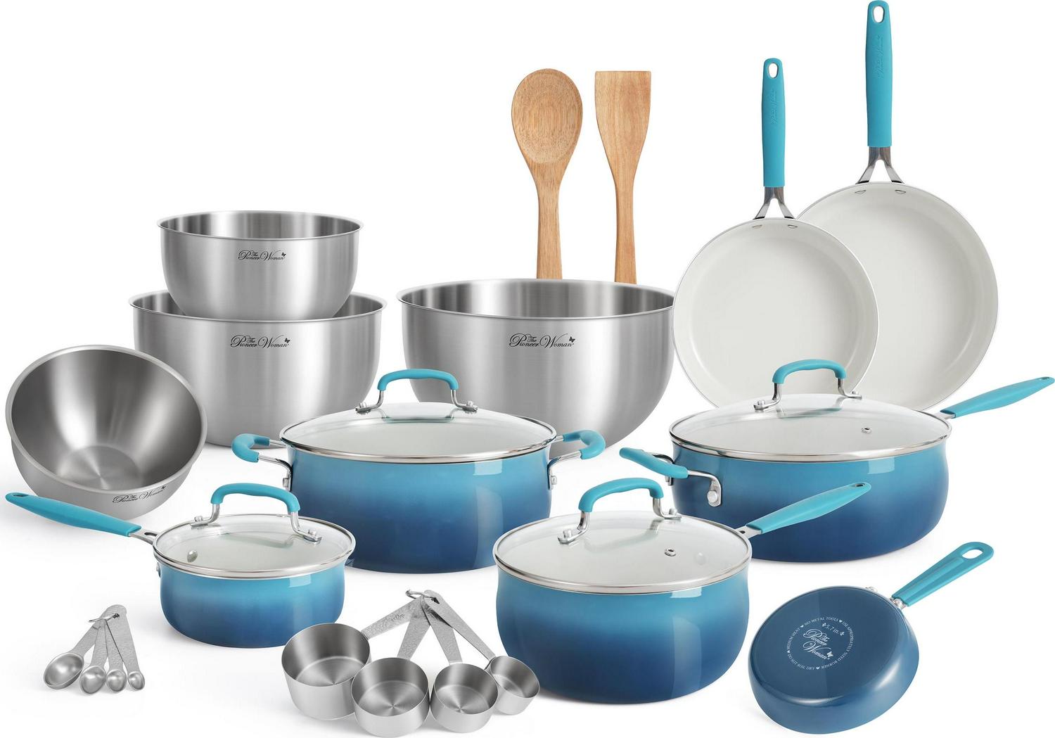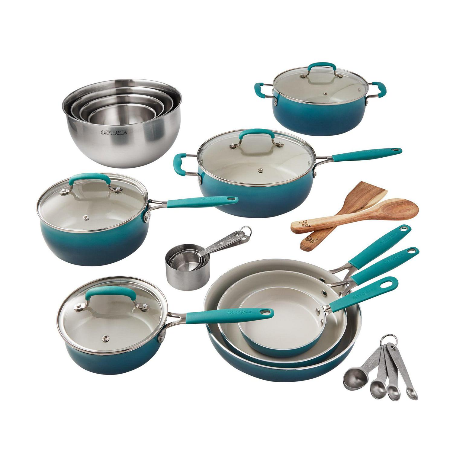 The Pioneer Woman 25 Piece Ceramic Nonstick Aluminum Cookware Set, Ombre Teal