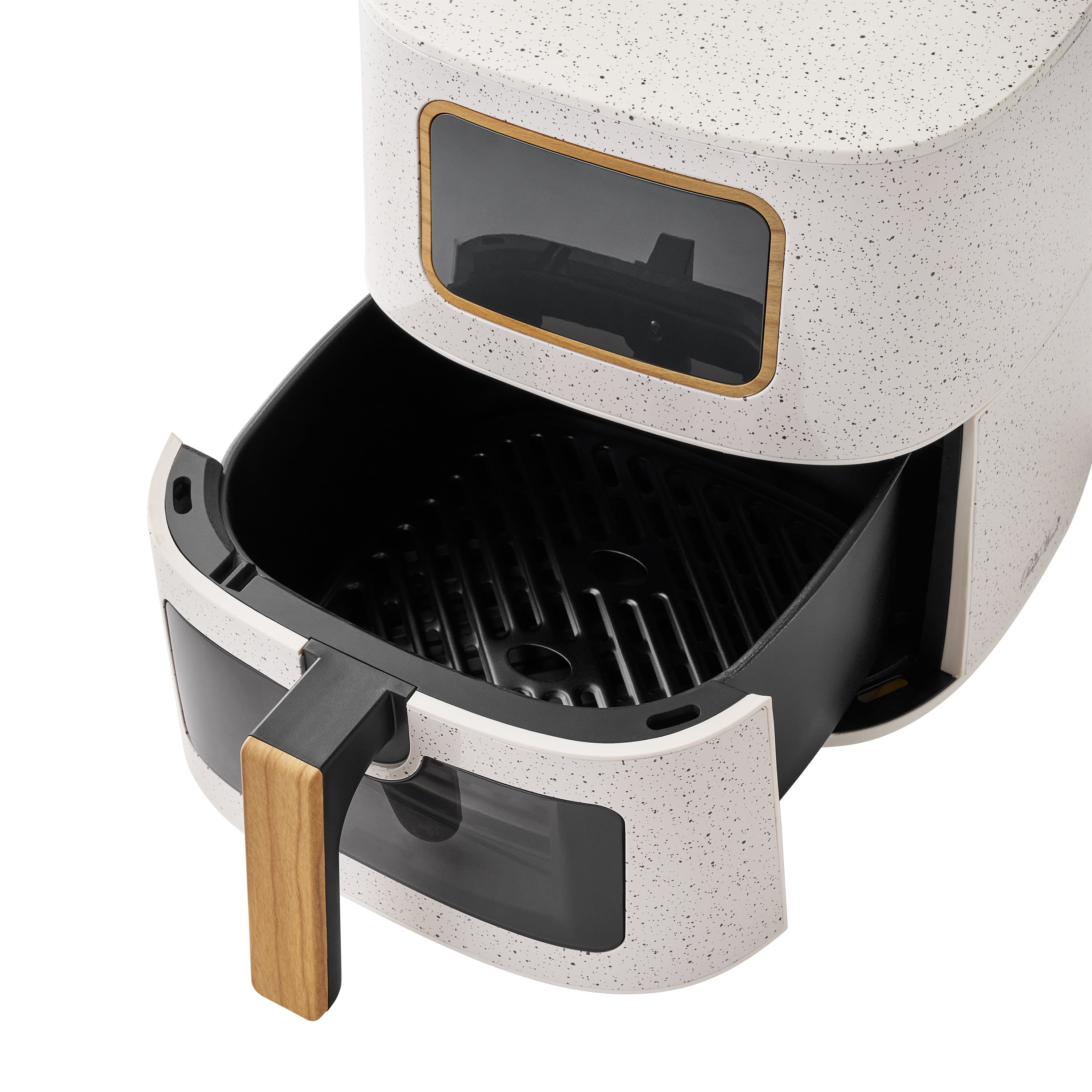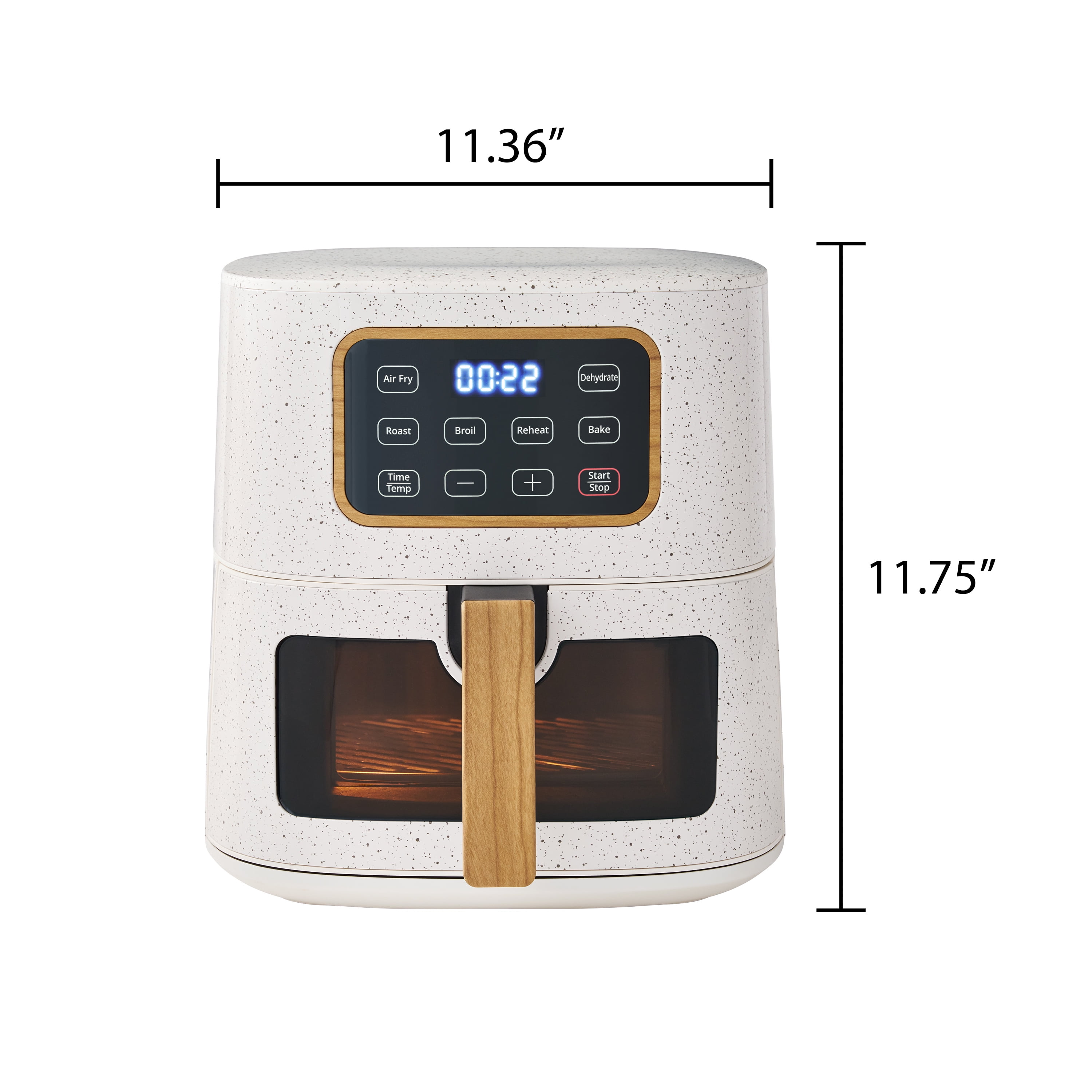 The Pioneer Woman Linen Speckle 5.8 QT Air Fryer is an innovative and stylish addition to any kitchen. With its stainless steel housing and wood grain design, this air fryer exudes a warm and sophisticated aesthetic that will complement any home decor. The see-through window and metal chamber allow for a satisfying cooking experience, ensuring your meals are not only delicious but also visually appealing. This air fryer boasts an impressive 5.8 Qt capacity and 1500W of cooking power, making it perfect for satisfying your cravings and serving your loved ones. Whether you’re cooking for a small family or hosting a party, this air fryer can handle it with ease. The 6 one-touch cooking preset menus (Air Fry, Roast, Bake, Broil, Dehydrate, and Reheat) make it easy to prepare a variety of dishes with minimal effort. The see-through window allows for continuous monitoring of your food’s progress, ensuring your meals are cooked to perfection and your kitchen stays safe and clean. Additionally, the auto-pause feature ensures the air fryer will automatically pause when the basket is removed, providing a seamless and safe cooking experience. Cleanup is a breeze with the dishwasher-safe non-stick basket and crisper tray. The fluoride-free non-stick coating ensures your food is cooked with minimal oil and maximum flavor.