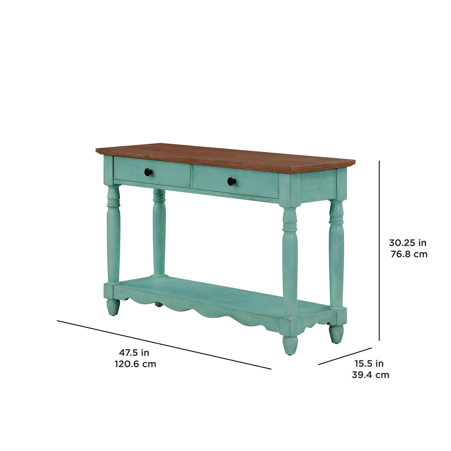 - Console table measures 47.5″ L x 15.5″ W x 30.25″ H