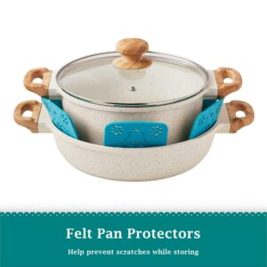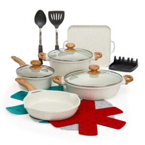 – Nonstick pots’ and pans’ durable, speckled cast aluminum construction is both beautiful and functional