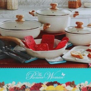 Everything you need to make a delicious homecooked meal is right here in The Pioneer Woman Prairie Signature 14-Piece Cast Aluminum Cookware Set. This cookware set will have any kitchen instantly dressed for culinary success with its full range of everyday cooking essentials. Each pot and pan is made from durable cast aluminum that heats quickly and evenly and features a long-lasting nonstick interior for easy food release and cleaning. Plus, their speckled enamel exteriors will not change color or fade when heated, delivering long-lasting beauty to your cookware collection. Just use the included felt protectors that go between each piece to help keep them safe from scuffs and scratches while in storage. Be sure to use the utensils and their rest while you’re cooking too! The rest’s prongs and slotted design will not only hold each of the included utensils in place, but it will also catch drippings as they sit, allowing you to enjoy a clean and organized cooking session time and time again. Add a little country to your home cooking with The Pioneer Woman Prairie Signature 14-Piece Cast Aluminum Cookware Set.Meet Ree:Ree Drummond is a NY Times Best Selling Author, TV personality, social media phenom, and the woman behind the popular Pioneer Woman lifestyle blog that started it all. She’s also a lover of butter, basset hounds, Ethel Merman, her hunky, cowboy husband Ladd, and their four kids. Her casual country style and delicious recipes have made her a go-to for all things cooking and entertaining.