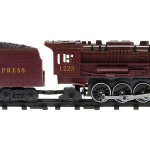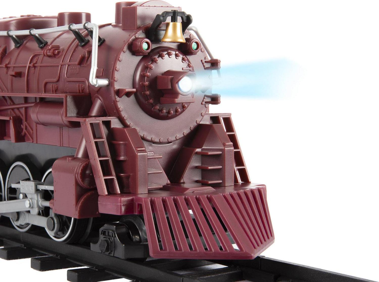 This thirty seven piece ready to play battery operated train set features authentic train sounds, special announcements, wireless remote and a working headlight. These large scale trains operate in both forward and reverse directions, are powered by an easy to operate RC controller and designed for children ages four years and up. The exclusive track system allows you to create a circle, a rectangle or an oval layout. Train Set requires six C Cell batteries and three AAA batteries for operation that are not included.