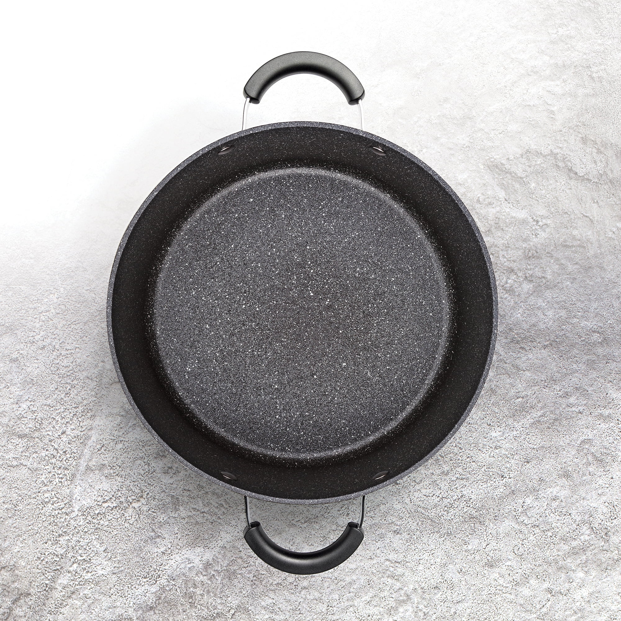 Straight, tall cooking sides for easy stirring Great look for oven to table service Vented, glass lid for stress-free food monitoring Riveted handles for comfortable and secure grip Extra-thick forged aluminum base for optimal heat distribution Large cooking surface and capacity with patented Rock. Tec(TM) surface treatment Includes user guide