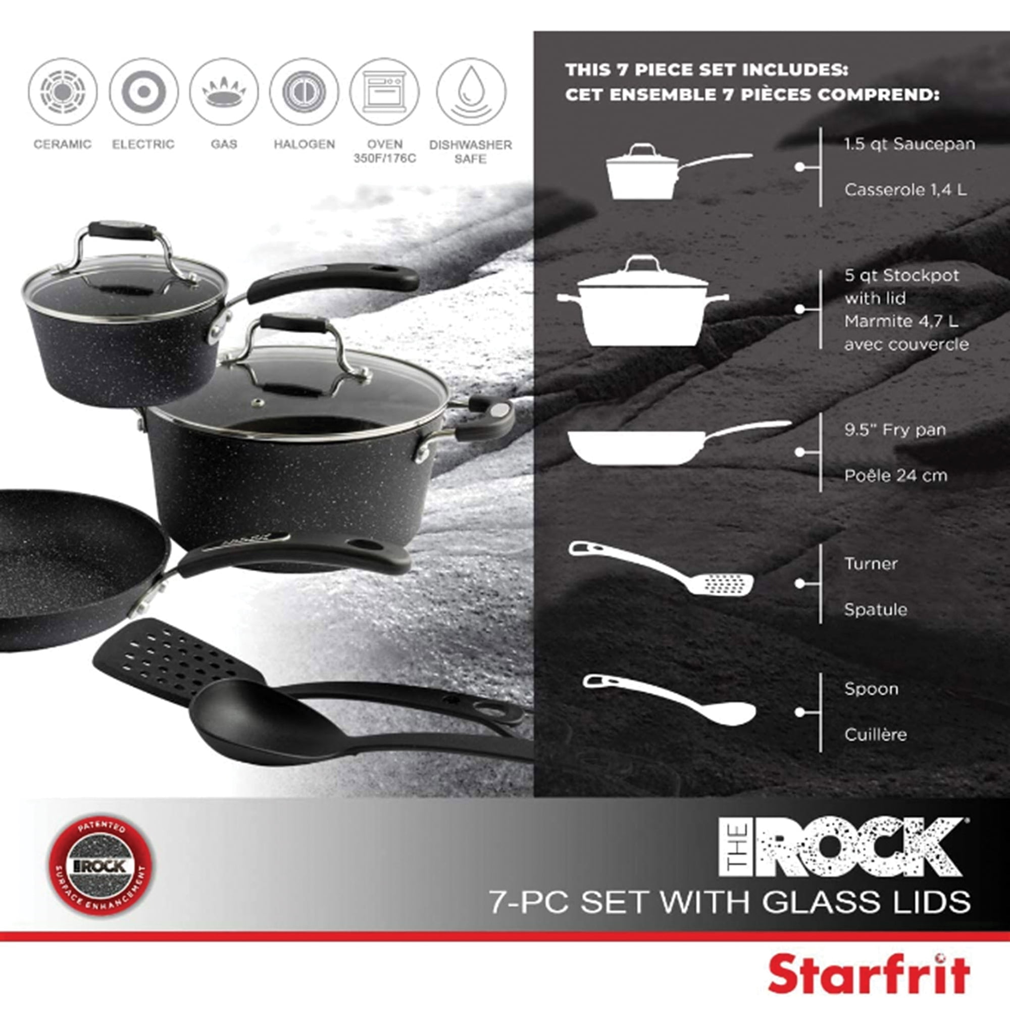 The Rock by Starfrit 7-Piece Cookware Set includes a 1.5-qt. sauce pan with lid, a 5-qt. stock pot with lid, a 9.5-in. fry pan, a nylon spoon, and a nylon turner. The Rock.tec surface treatment makes it ultra durable and provides a 3x better nonstick release. The set is ideal for both beginning cooks and experienced chefs.