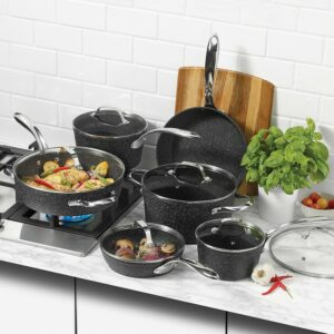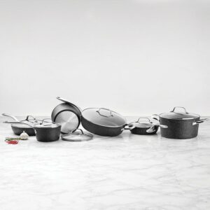 The Rock by Starfrit 12-Piece Cookware Set includes everything you need for saucing, stewing, frying, or boiling in the kitchen. It includes a 1.5-qt. saucepan with lid, 3-qt. saucepan with lid, 8-in. fry pan with lid, 10-in. fry pan with lid, 5-qt. stockpot with lid, and a 12-in. (5.3-qt. deep) saute pan with lid. The thick, nonstick coating makes for quick cooking and release of eggs, steaks, and more. See-through tempered glass lids let you view what’s cooking without lifting the lid while steam-release vents keep the pans from boiling over too quickly. The rock-like surface is also highly scratch-resistant, so feel free to use your favorite metal utensils with this cookware. The stainless-steel handles are oven-safe up to the broil setting for even more flexibility. Cleanup and serving is a breeze as this collection goes from stovetop to oven to table to dishwasher. The patented manufacturing process of this cookware set modifies the surface to form an ultra-durable, rock-like finish with outstanding release. 3x better than traditional nonstick cookware, this cookware is designed to never stick, never warp, and last longer than other nonstick cookware. The cookware features stay-cool, riveted stainless steel handles for stovetop cooking. However, since these pans are also oven-safe, be sure to wear oven mitts when removing them from the oven because the handles will become hot. This set of pots and pans is PFOA-free and suitable for all stovetops including induction.