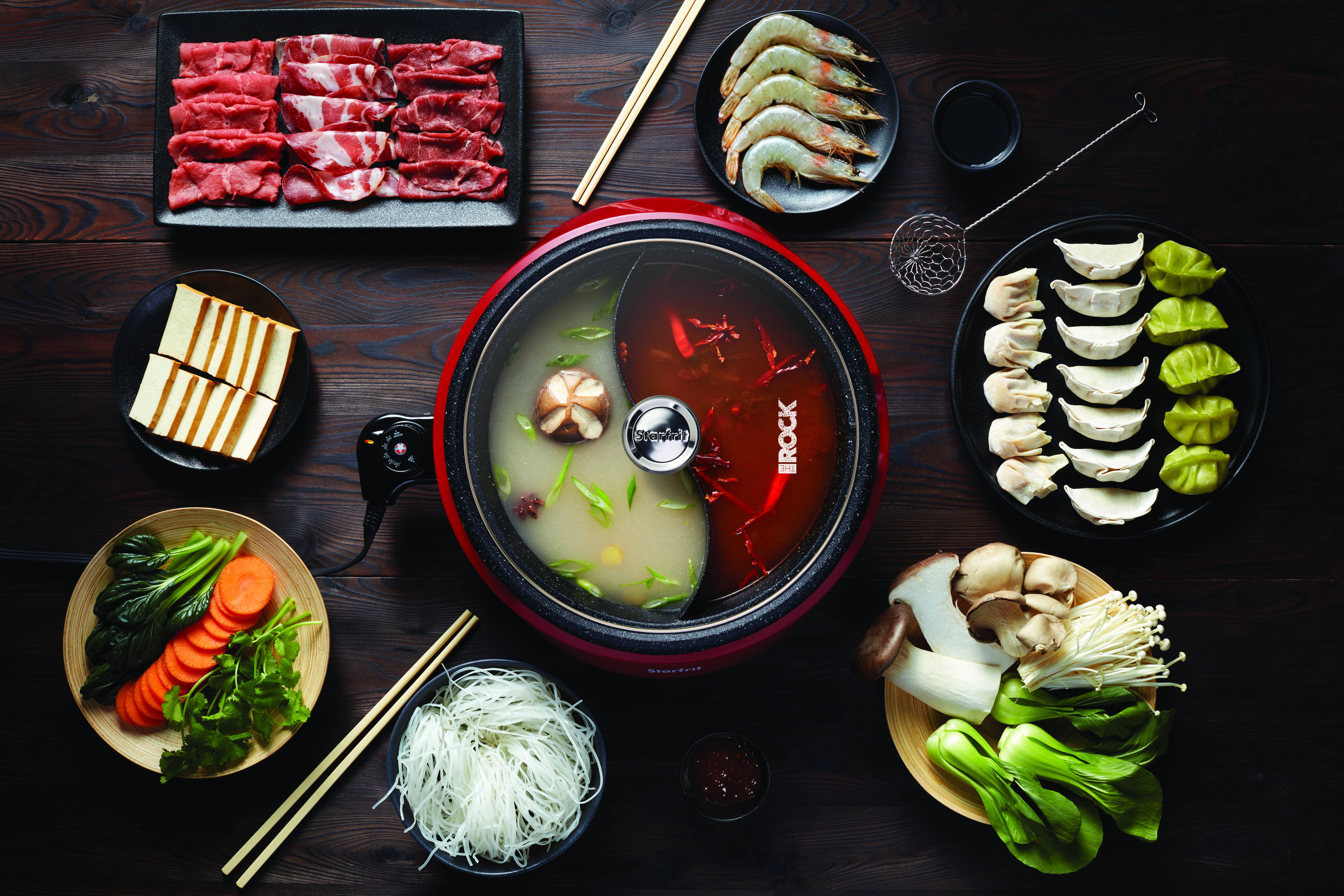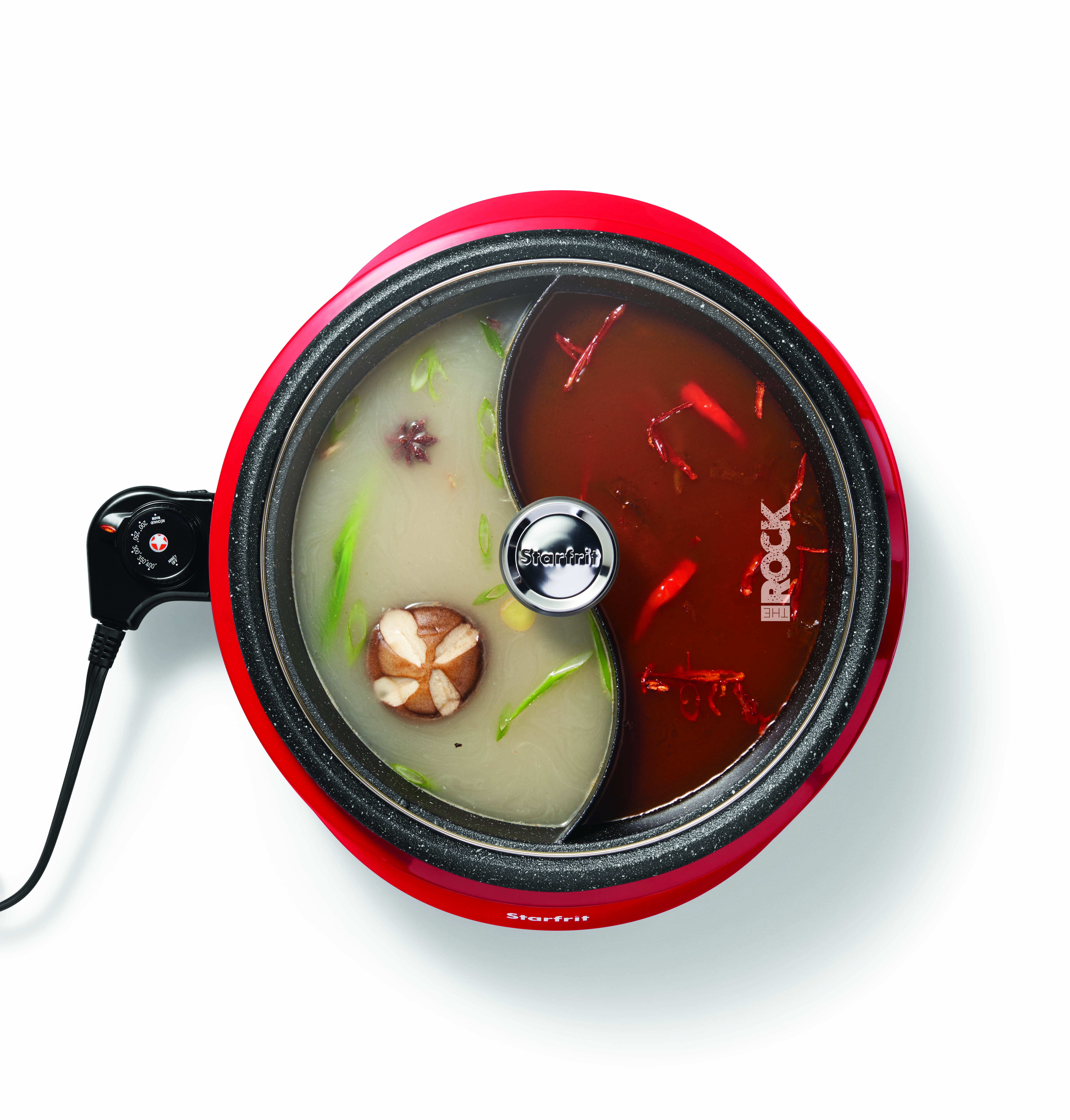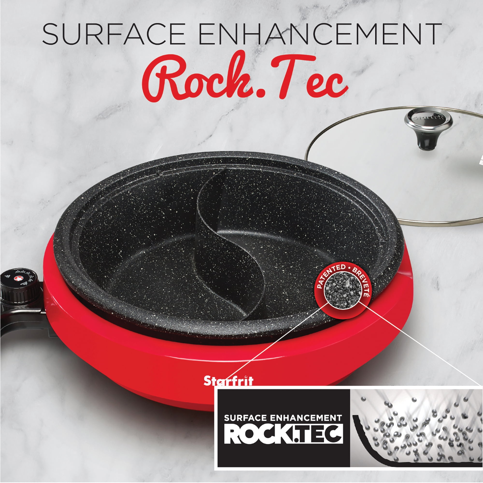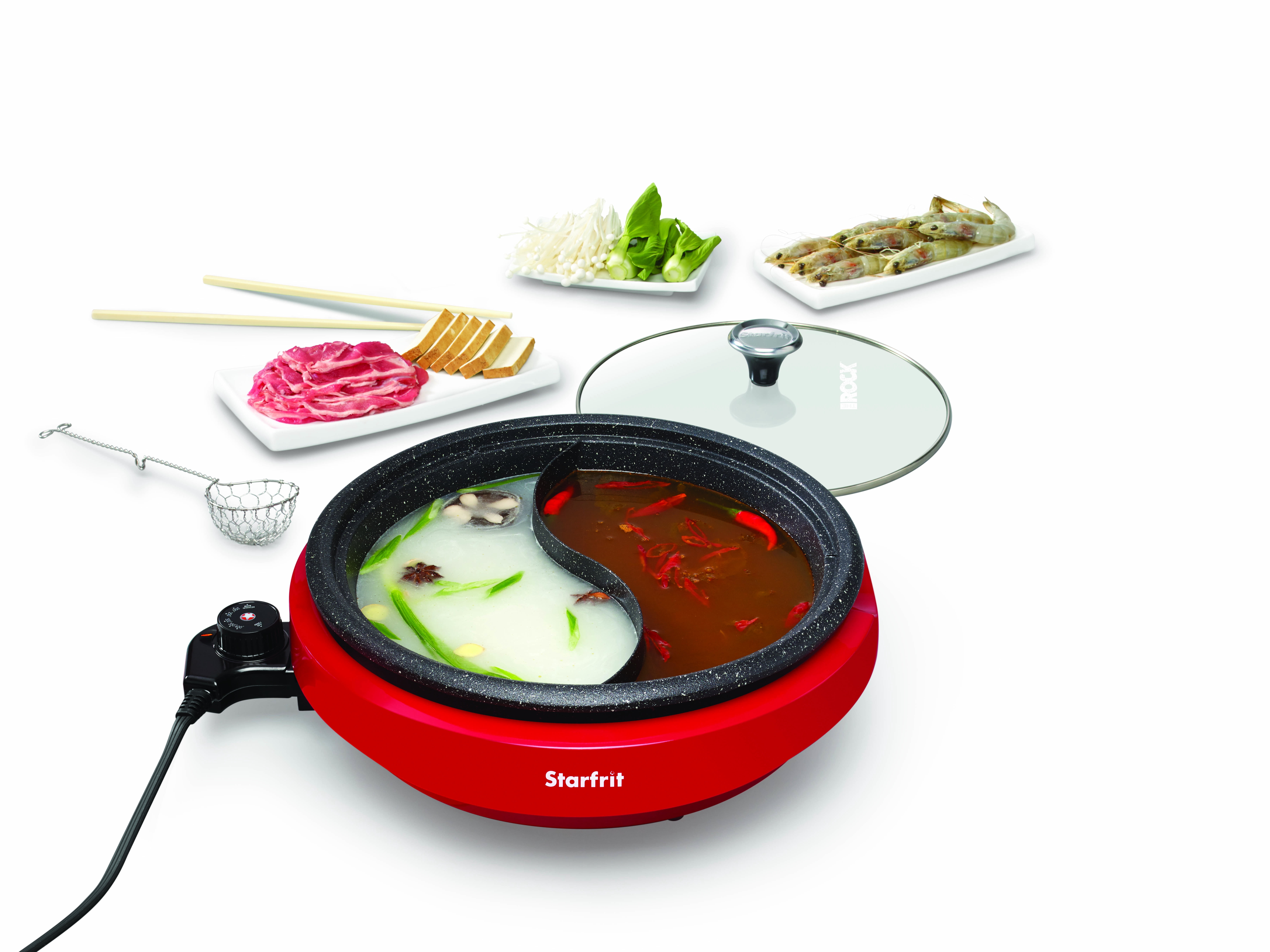 Overview THE ROCK by Starfrit Dual Sided Electric Hot Pot features patented ROCK non-stick technology and has an extra thick removable cast aluminum vessel. The hot pot has a 3.2 qt. capacity and has a divided cooking vessel for different flavored recipes. It also has a tempered glass lid with a cool touch handle and a decorative cool touch base, as well as an adjustable temperature control. Features 3 liter capacity 1,200 watts Easy to clean Adjustable temperature control Decorative cool-touch base Tempered glass lid with cool-touch handle Includes instruction manual
