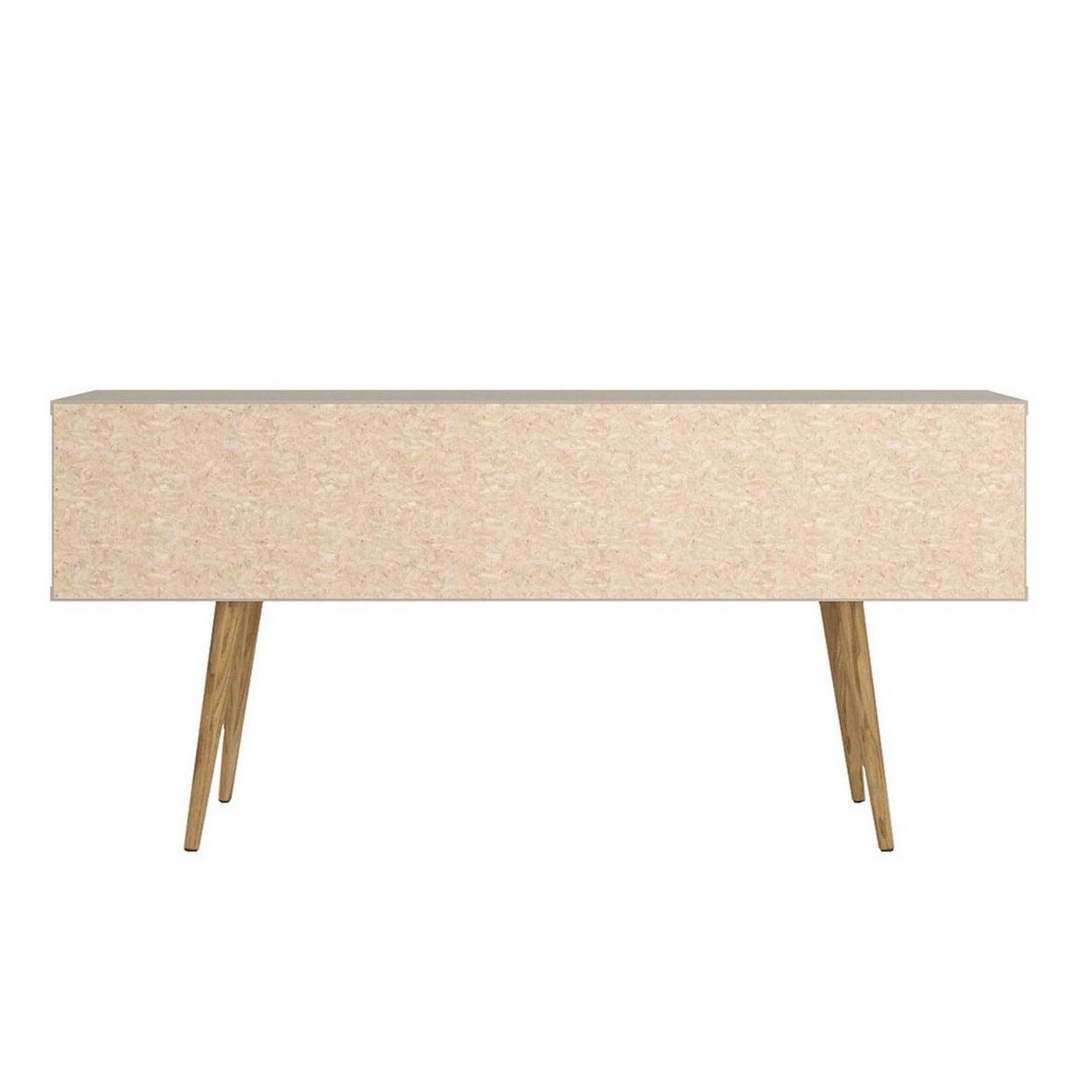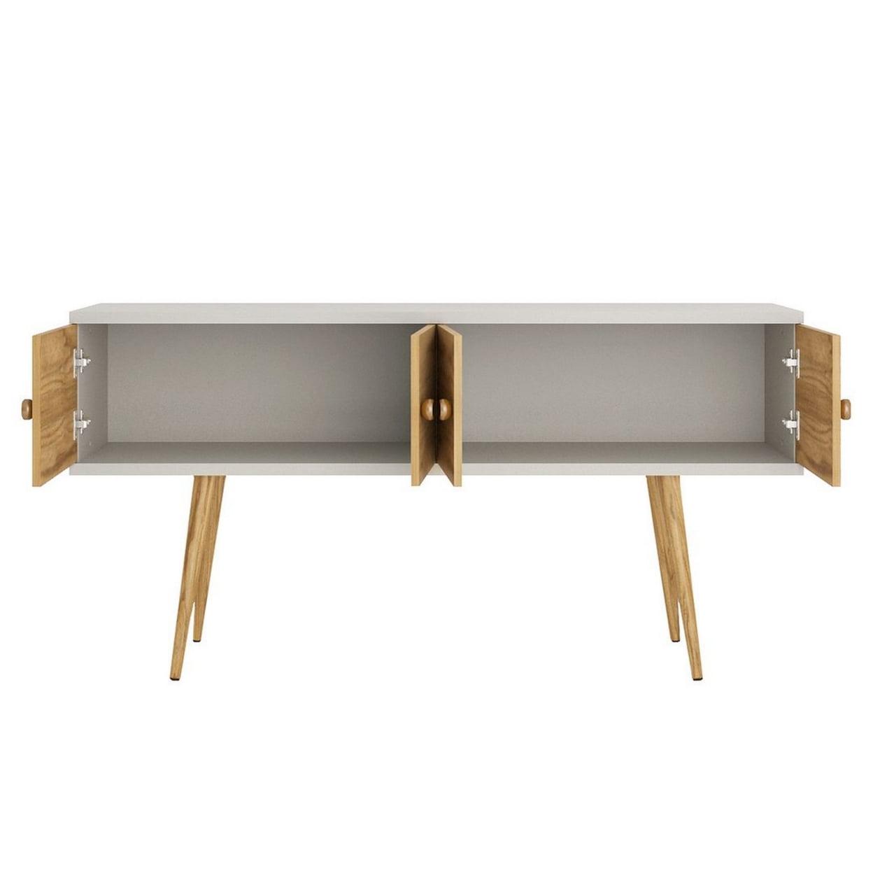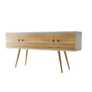 Theodore 60.0 Sideboard with 2 Shelves in Off White and Cinnamon Mid-Century modern at its very best, the Theodore sideboard adds a whole new element of bringing the chic back to entertaining. Beautifully crafted from natural wood, from its splayed legs to its artful height and clean finish, subtle sophistication is working for this piece easily making it a focal point for any space. A set of double cabinet doors on each side reveal ample storage space for dinnerware, linens, books, albums, and beyond. A smooth base allows for displaying picture frames, artful sculptures, vases, mail tray, and more. Hang a unique mirror or modern art above for a bold showstopping statement.