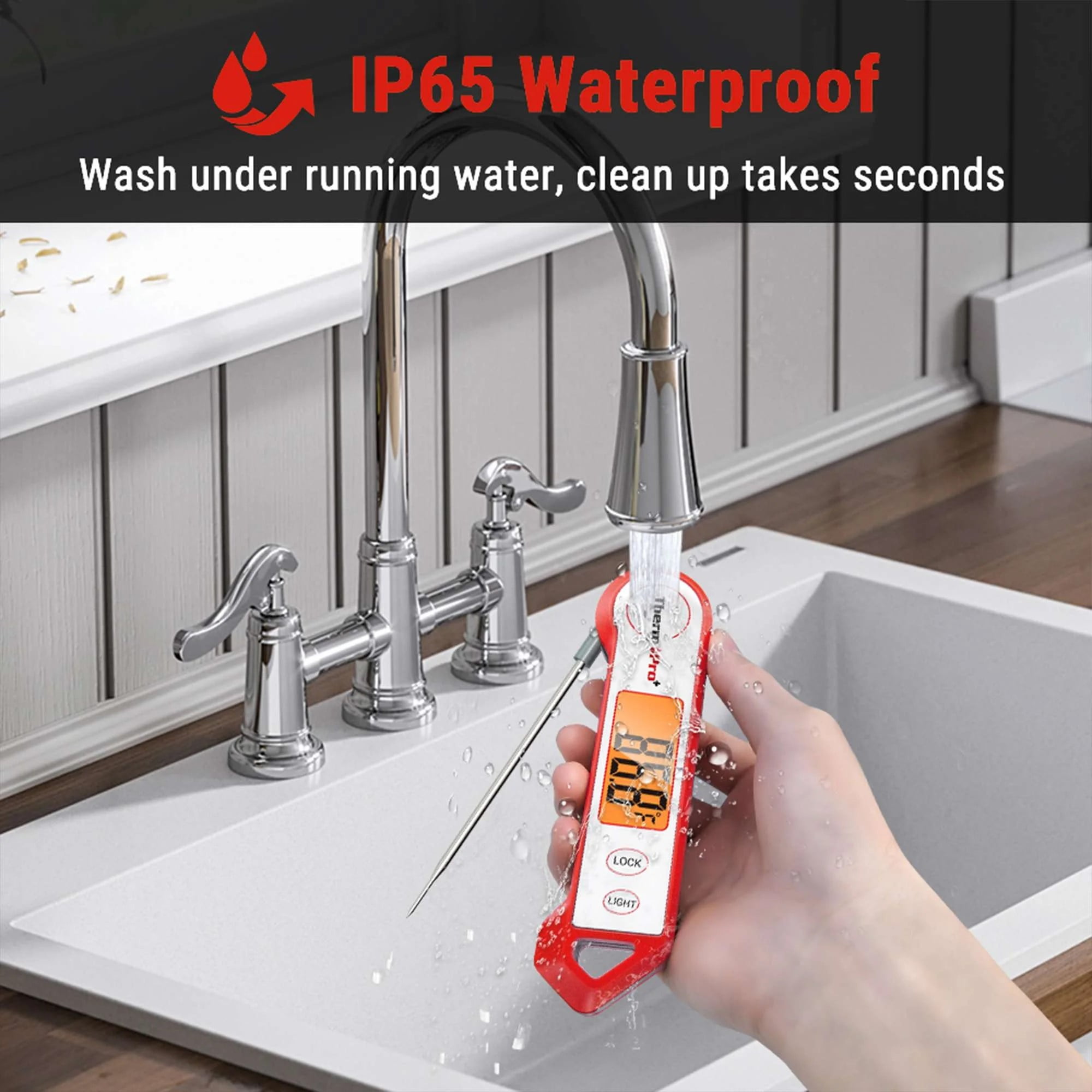 Waterproof: You don’t need to worry about your meat thermometer getting splashed with water or rained on outside, the ThermoPro TP19HW is a 100% waterproof unit. Feel free to wash it under running water when cleaning it as well Super-Fast: Instant read thermometer with backlight features a precise food grade stainless steel probe. It achieves a temp reading within only 2-3 seconds by using a high quality thermocouple sensor. And only weighs 2 ounces. Highly Accurate: Cooking thermometer has a temp range of -58 ~ 572 degree Fahrenheit (-50 ~ 300 degree Celsius); highly accurate to ±0.9 degree Fahrenheit; Perfect for indoor outdoor cooking, grilling, and BBQ. Calibratable: Cooking thermometer with calibration mode that allows you to re-adjust the sensor readout if needed after long use. Never purchase another thermometer! Rotating LCD Display with Large Digits: Grilling thermometer with 180 degrees rotating display making it easy to use with either hand or awkward angles. No more struggle in tight or dim spaces when checking on your food