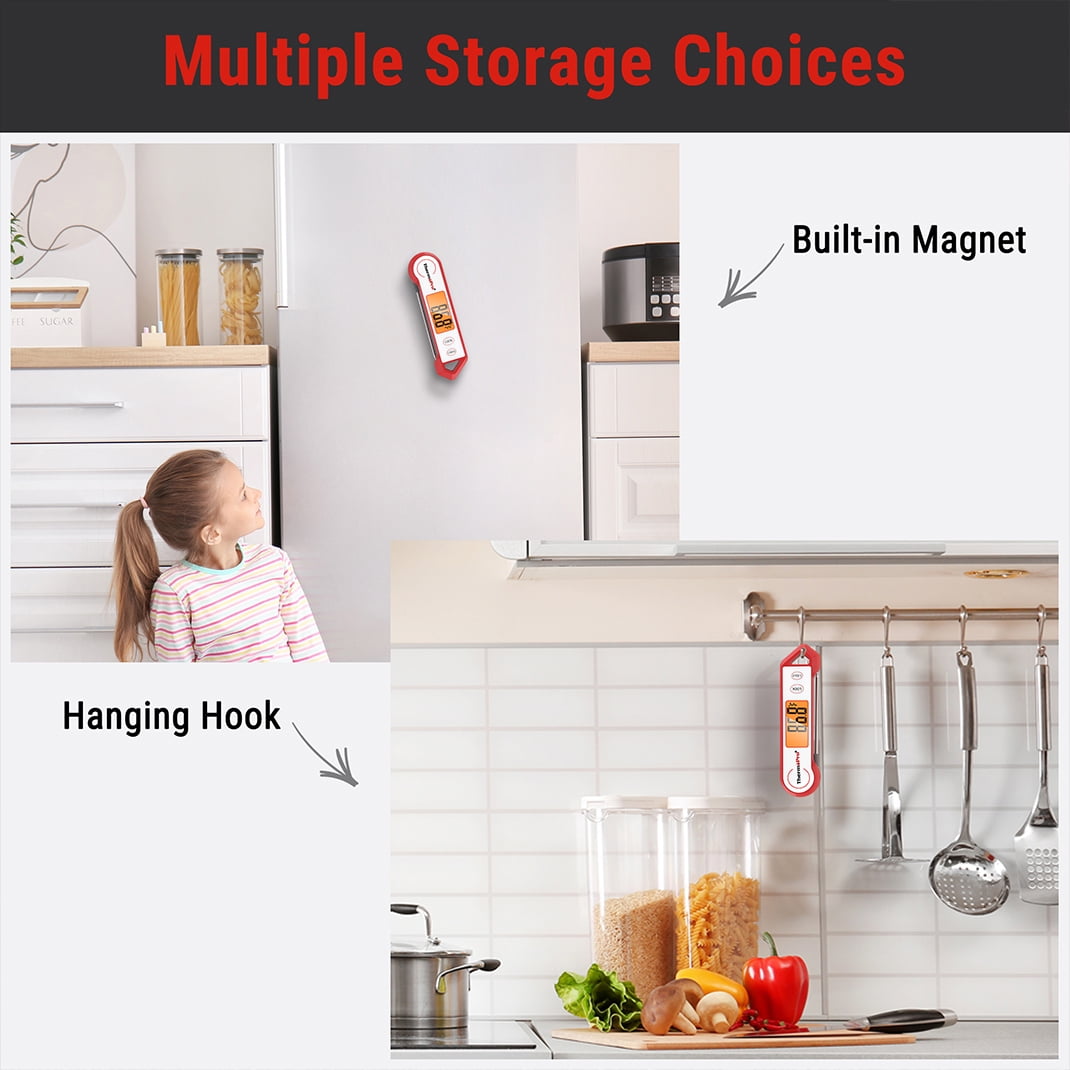 Make perfectly cooked meat consistently with ThermoPro TP19HW. This well-built waterproof digital thermometer will give you an accurate temperature in the matter of 3-4 seconds every single time. It comes in a compact foldable design with a magnetic back and kitchen hook. You can stick it on the fridge or on cupboards for easy storage and access. Only weighs 2 ounces. The TP19HW is a must have tool for experienced and inexperienced cooks alike.