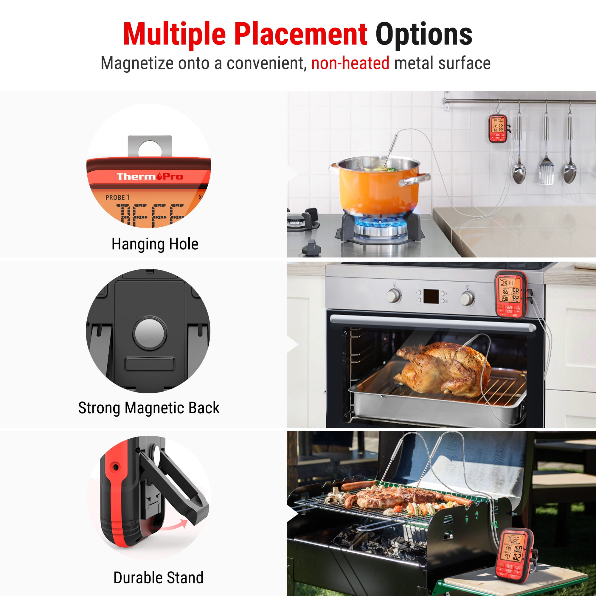 Ensure culinary perfection with the advanced ThermoPro TP828BW. Featuring dual probes, it enables simultaneous monitoring of two meat cuts or one piece and ambient temperature in your grill or smoker. With an impressive 1000ft signal range, avoid constant checks. This frees you to multitask in the kitchen or enjoy a game while overseeing outdoor cooking. Crafted with durable materials and equipped with a clear LCD display, it excels in accuracy and ease of use.