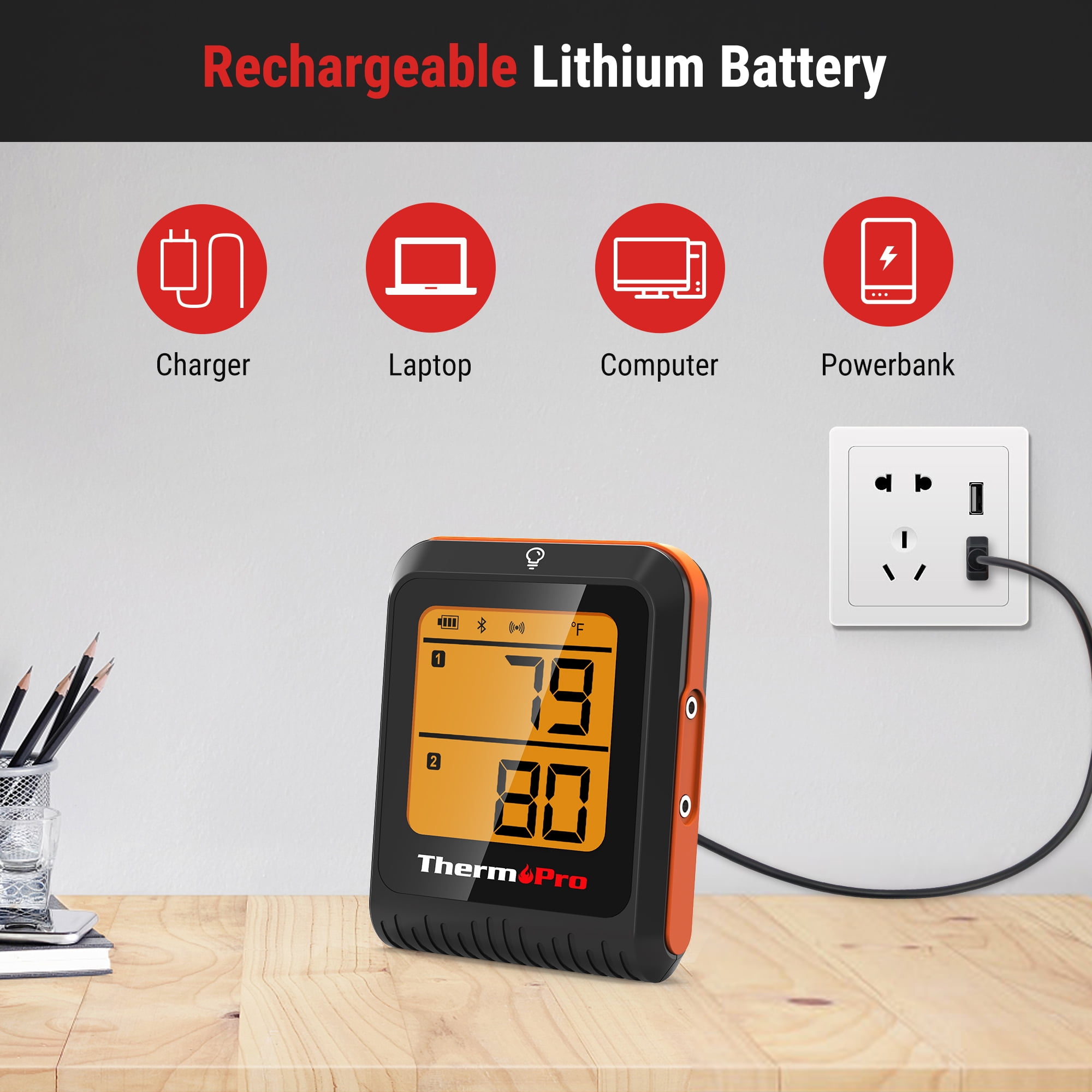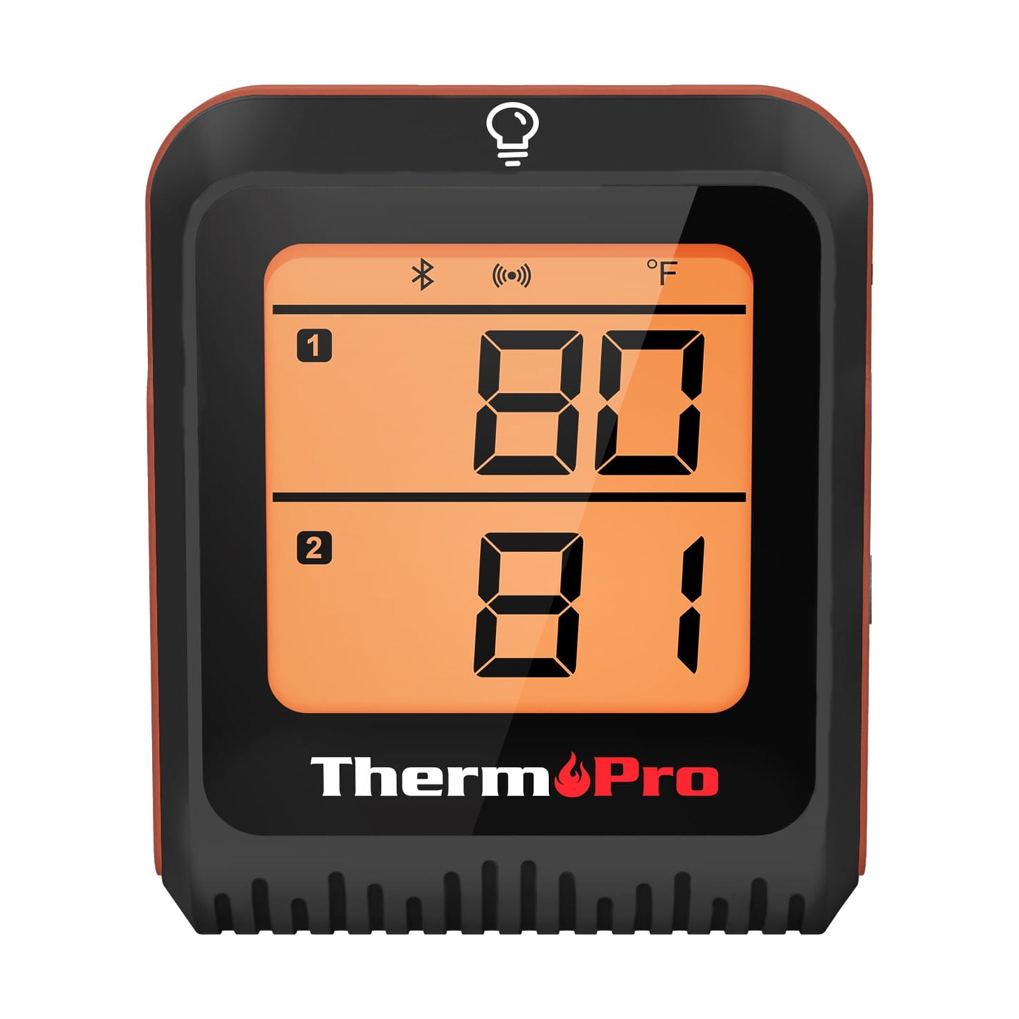 500-Foot Remote Range: ThermoPro TP920W features advanced Bluetooth 5.0 technology that provide a strong, effective connection to track temperatures from 500 feet away. Simply leave this grilling thermometer beside your grill or oven and remotely monitor your cooking progress using your smartphone Highly Accurate: Wireless thermometer features dual BBQ temperature stainless steel probes which can simultaneously monitor internal meat temperatures and ambient temperatures up to 572°F with an accuracy of ±1.8°F Multi-functional App: Receive real-time alerts on the go with the ThermoPro BBQ App on your phone. Set your desired food temperatures, customize alarms and timers, and view graphs. Preset USDA-recommended temperatures for types of meat help you to cook to perfection Effectively Manage Your Time: Equipped with an advanced algorithm, this smoker thermometer wireless can estimate proper cooking times to help better plan your meals. Pre-alarm settings (5/10/15°F) ensure your meat is removed from the heat at the perfect time. Rechargeable Transmitter with Backlight LCD: This rechargeable Bluetooth thermometer can hold a charge for 8 months, providing worry-free operation that doesn’t require frequent battery changes. Large backlit LCD display shows temperatures for both stainless steel probes, allowing this meat thermometer for smokers to easily convey important info with just a quick glance