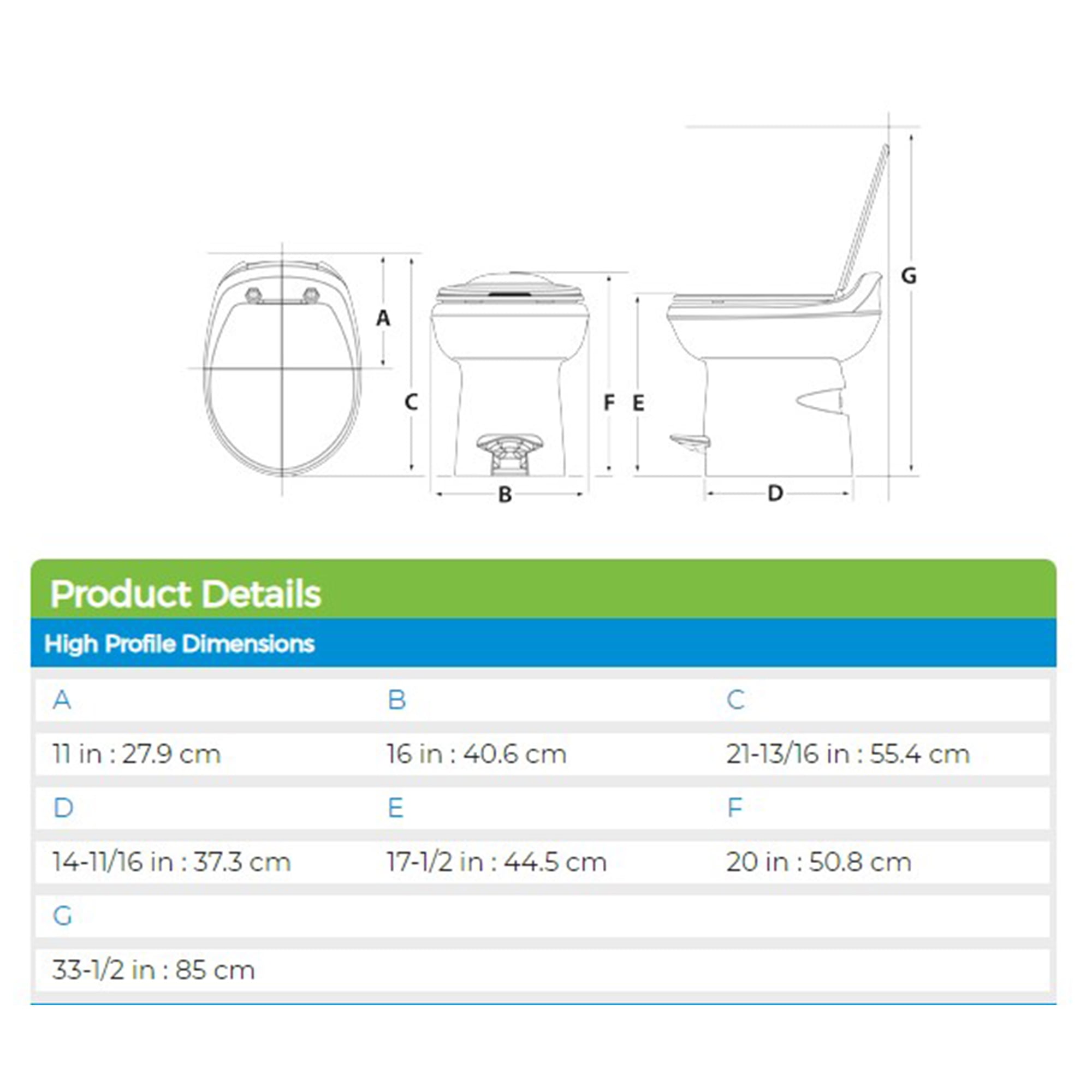 Beautiful, stylish toilet gives your RV bathroom a comfortable, contemporary, and easy-to-clean commode Flushes powerfully, covering 100-percent of the bowl with the single-pedal flush mechanism Flush valve wipes clean with every flush so you don’t have to worry about waste buildup Anti-microbial seat inhibits the growth of stain and odor-causing bacteria so you don’t need to worry about stinking up the RV Taller, 17.5-inch high and full-size residential seat is customizable, letting you fit it to your style Installation type: Floor-mounted Color: Bone Dimensions (L x W x H): 19.50 x 25 x 22 inches Weight: 45 pounds