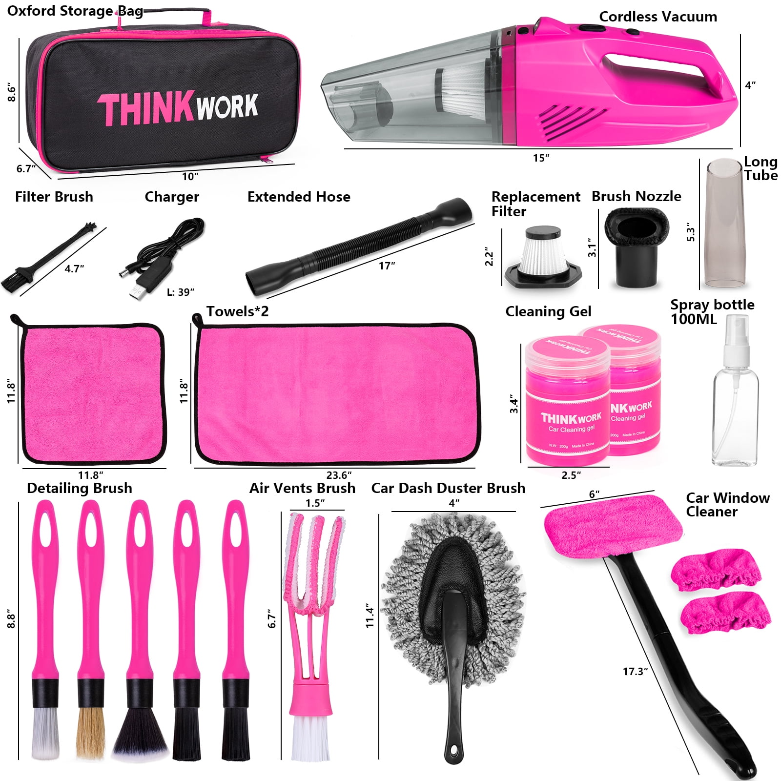 Pink Car Cleaning Kit Accessories Include—1*Cordless Handheld Vacuum(with 1 mini brush,1* USB Port,3 accesssories and 2 washable filter ),5*Detailing Brushes,2*Cleaning Gel,1*Windshield Brush,2*Cleaning Pad,1*Air Vent Brush,1*Spray Bottle,1*Duster Brush,2*Microfiber Towel,1*Storage Bag. Complete car interior cleaning supplies. 8000Pa Powerful Pink Wireless Handheld Vacuum—This 120W cordless, portable pink car vacuum cleaner offers convenience for your cleaning. The three included accessories, mini brush, and filter paper help clean hair and dust that stick to objects, as well as clean crevices and corners in your car and home. The separate LED light button design helps you clean in the dark. This USB-port rechargeable vacuum cleaner takes 3-4 hours to fully charge. The run time is about 20 minutes when fully charged. Five Detailing Brushes WIth Different Bristle—Our five detail brushes with different bristles can meet your different cleaning needs and can be used both wet and dry. Ergonomically designed, the bristles are smooth and do not fall off easily. Fiber brushes, pig bristle brushes and super soft non-marking brushes have soft bristles and will not cause any scratches on your car. Nylon brush bristles are harder to clean car wheels, engines, etc. Auto Interior & Exterior Care Kit—Cleaning soft gel, duster brush, air vent brush and detailing brush used with vacuum cleaner can remove dust and debris from the interior corners, crevices of the car. The towel and windowshield brush can clean the exterior of the car, and used with water and foam can easily show a shiny car. This multifunctional car detailing kit will bring you a more relaxed cleaning experience. Thinkwork Car Interior Cleaning Kit is comprehensive and versatile. Each accessory is practical and of excellent quality, helping you to clean your car efficiently and conveniently.