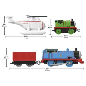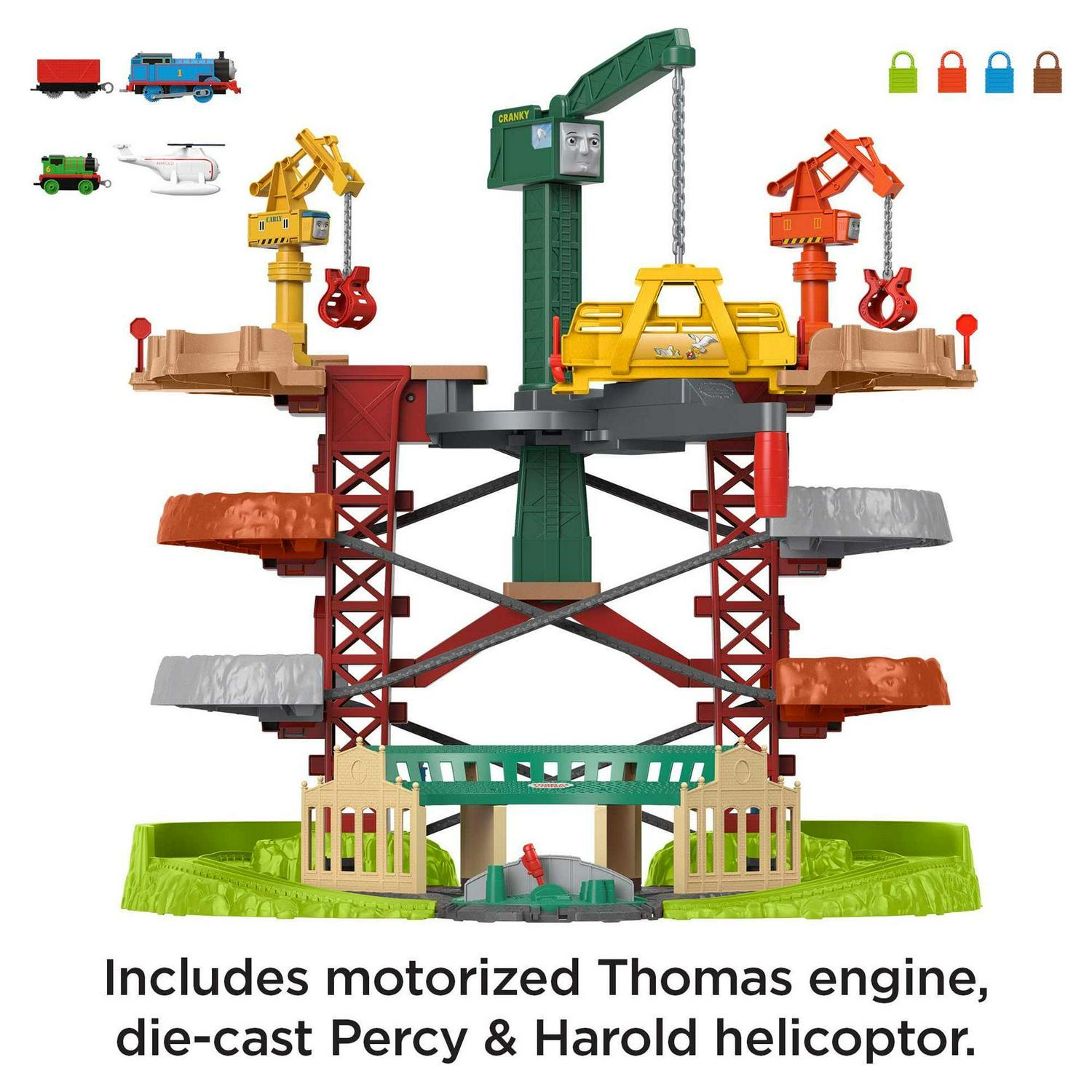 – Comes with motorized Thomas engine, die-cast Percy engine, Harold the helicopter, and 4 cargo crates for loading and unloading