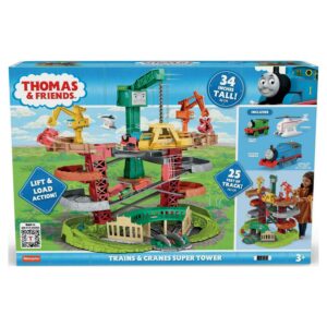 The Thomas & Friends Trains & Cranes Super Tower from Fisher-Price brings to life all the exciting racing, chasing, loading and unloading action from the Thomas & Friends show in one awesome playset. At over 2 feet tall, this multi-level train and track set features favorite places and characters from the show, plus a spinning turntable, three cranes to load and unload cargo, and track for the engines to zoom around. Kids control all the exciting action, using handles and switches to decide where the engines go. Compatible with other Thomas & Friends track, except wood, kids can connect additional track to this set to expand the railway play! (Additional track sold separately and subject to availability.)