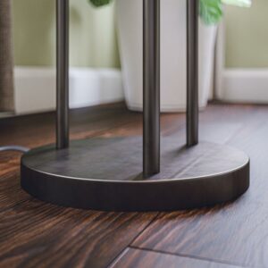 A sleek and slender warm bronze torchiere adds plenty of welcoming, room-filling light to your home. The amber iridescent glass shades add a warm look to your living spaces, ideal for small space living with the bright illumination from the included vintage-style LED Edison bulbs. Place this tall torchiere in your vintage home offices, industrial living rooms, or transitional entryway for bright lighting and traditional style.