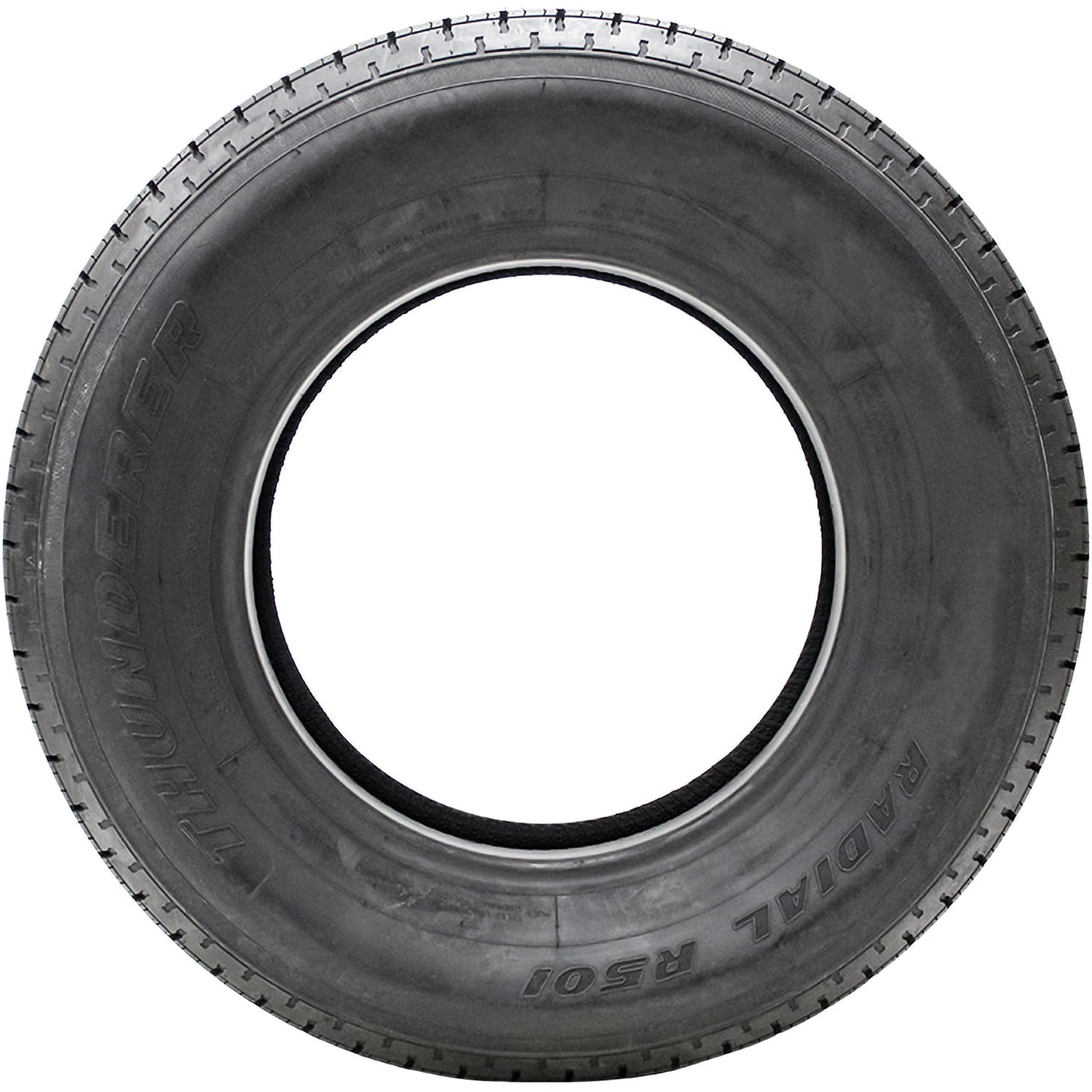 Thunderer Radial R501 OVERVIEW The Thunderer Radial R501 is a highway terrain, all season tire specifically manufactured for trailers. This model is a special trailer or ST tire. IT IS NOT MEANT TO BE USED ON PASSENGER OR LIGHT TRUCK VEHICLES. This specific trailer tire provides excellent control to the towing vehicle, thanks to its firm sidewalls and constant road contact. The five-rib tread design’s solid center rib improves the road contact by closely following the road surface. The great road contact is further increased by the tread design’s superb all weather road gripping ability. The tire is capable of performing in dry, wet, and light winter weather conditions, which improves the traction and driving stability. The better stability increases the controllability of the trailer and offers a safer driving experience. The model offers a longer-lasting tread life. The tire starts with a deeper tread depth to ensure longer usability. The solid center rib’s maintained road contact keeps the tire glued to the road surface and prevents irregular wear patterns from forming across the tread area. The elements increase the tire’s usability and tread life. The Radial R501’s internal structure features twin steel belts reinforced with a double jointless spiral overlay and a full nylon overlay. They increase the tire’s load-carrying capability by reinforcing its structure and provide strength and durability to the tire. The full nylon overlay also reinforces the tire against damages, such as tread separation. As a result, the tire is able to withstand and carry heavier weights and loads and has an overall stronger structure, making it perfect for mounting on trailers. Manufacturers recommend changing tires every 10 years. As long as tires are properly stored before they are sold, the year of their manufacture will not shorten their service life.
