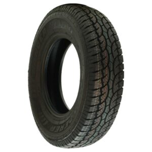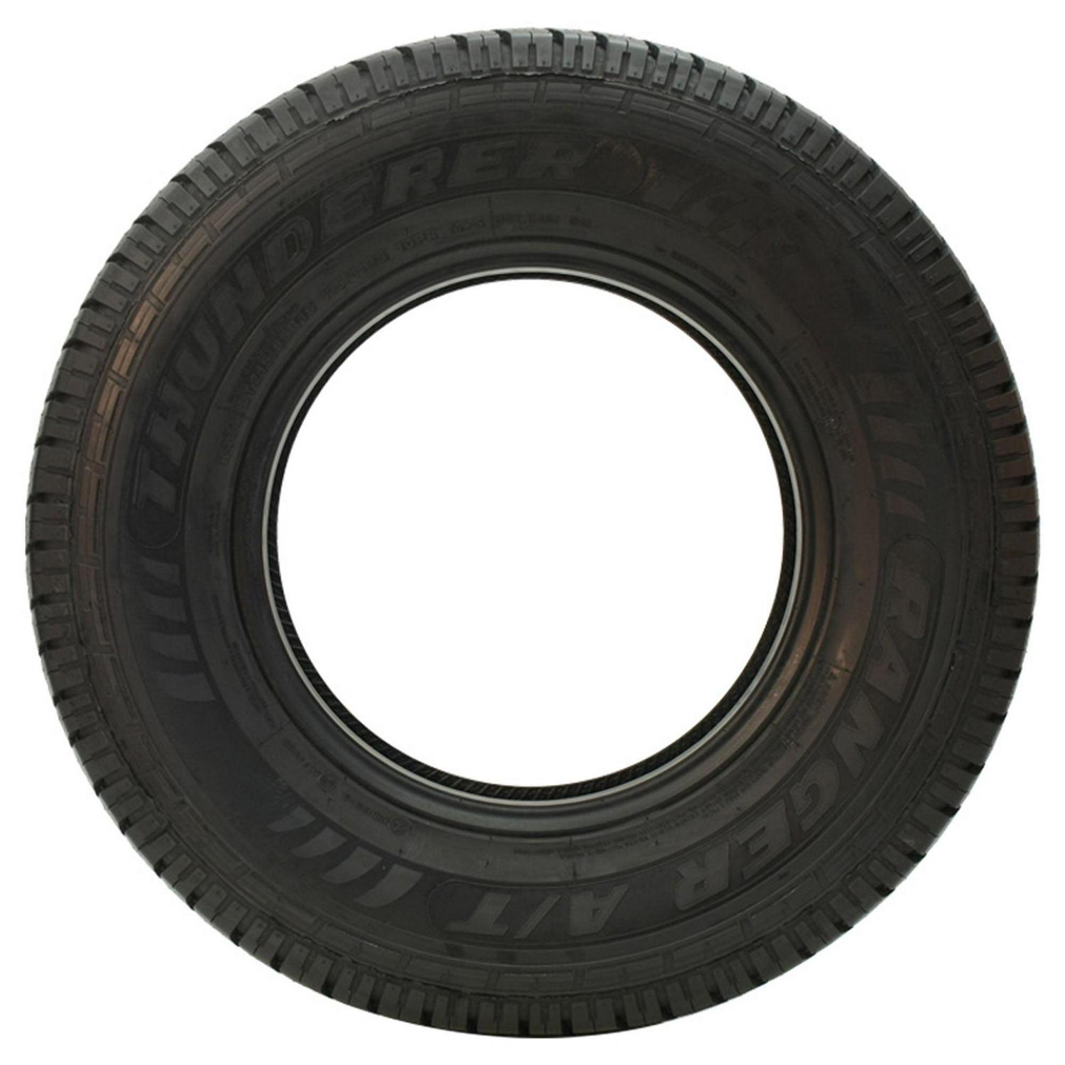 The Thunderer Ranger A/TR is an all terrain, all season tire manufactured for SUVs and light trucks. Thunderer offers a 45,000 mile treadwear warranty with light truck sizes, and a 50,000 mile treadwear warranty with SUV sizes of this model. The tire promotes great all season traction. The stabilized, detailed footprint and the all season compound greatly improve the dry, wet, and winter weather grip on the road surface. The stronger compound enables the tire to greatly upgrade the rubber flexibility in versatile temperatures, enhancing the summer and winter weather grip. The tread design with the staggered blocks and the zigzag sipes also upgrades the grip on the road surface with the use of extra biting edges. The tread area is pinned for studs, which can further increase the surface traction. During the tire’s on-road drive allows the tire to effectively prevent hydroplaning in wet conditions. All terrain traction is also guaranteed with the aggressive footprint. These tread elements allow the model to increase the soft, loose, and uneven terrain grip, promoting a better on- and off-road terrain traction. The footprint ensures the tire’s forward motion at all times, optimizing the deep mud and loose dirt terrain grip. The tread also keeps the footprint clean, as they eliminate mud, snow, and rocks stuck between the tread elements. As a result, mud and snow cannot block the surface contact, while stone retention does not damage the casing during the performance. The combination of these elements significantly boosts the versatile terrain traction. The model optimizes its controllability. The stabilized footprint ensures the surface contact while the tires are in motion, boosting the steering responsiveness and driving stability. As a result, the tire is able to securely upgrade the steering response time and accuracy to the driver’s commands, while the structure is also secured at all times. The reinforced construction allows the tire to keep the ideal tire shape under the load and driving pressure. This greatly boosts the overall load capacity, ensuring a safer performance. The Ranger A/TR upgrades its usability. The stronger compound and the stable footprint work together to enhance the service life. The wear-resistant compound keeps the rubber flexibility throughout the drive, minimizing the tread wear rate. The stable tread elements ensure even pressure circulation, avoiding irregular wear as well. The slow and even wear increases the service and tread life.