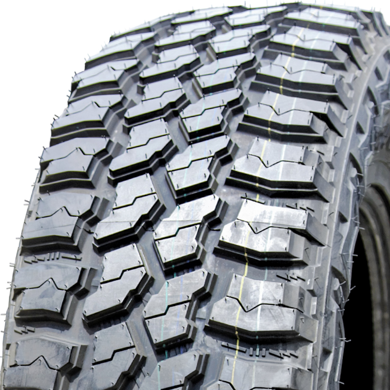 The tire enhances the mud-terrain performance. The aggressive tread design with the open and the tiered tread blocks increases the soft, loose, and uneven terrain gripping ability. These tread elements upgrade the grip on the road surface with extra biting edges, optimizing the forward motion at all times. This allows the tire to maintain the forward motion throughout the drive, through deep mud, and on loose dirt as well. This prevents the tire from getting stuck on various terrain surface conditions. The tread manages to keep a clean footprint. The grooves disperse mud and snow from the footprint, optimizing the performing capability.