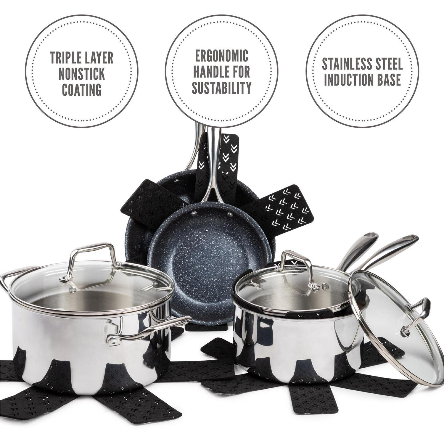 PRODUCT INFO:Oven safe up to 500ºF (260ºC) and ceramic reinforced, our Tri-Ply Collection was made for the versatile chef. Featuring Eclipse Moonscape triple layer heavy-duty nonstick coating, this set offers the best of nonstick for rapid and easy food release on a surface that is easy to clean. The stainless steel riveted handle offers maximum stability while cooking, plus the ergonomic design ensures comfort and easy handlingWHAT’S INCLDUED:4X Cookware Protectors2.5 QT Saucepan & Glass Lid3.5 QT Saucepan & Glass Lid6 QT Saucepan & Glass Lid8 Inch Fry Pan10 Inch Fry PanCARE & USE:Wash in warm water before first use. Do not soak for extensive periods. Hand wash recommended for product s longevity. Do not use in microwave. Do not use lid in oven. Avoid abrasive cleaners. Avoid using steel wool, steel scouring pads, or harsh detergents. Always use caution when handling over open flameABOUT THYME & TABLE:Thyme & Table is a unique collection of kitchen essentials curated for recipe gurus and enthusiastic foodies who crave bold style and unmatched quality. We have crafted a selection of kitchenware that will transform any kitchen into your personal cooking oasis. Explore all that Thyme & Table has to offer from cookware to storage necessities and cleaning basics and find the reliable and eye-catching products that compliment your colorful lifestyle