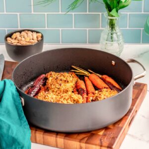 Thyme & Table Nonstick 15-Piece Hard Anodized Cookware Set is the pinnacle of culinary excellence. Designed to exceed the expectations of passionate chefs and home cooks alike, this collection redefines durability, versatility, and performance in the kitchen. Experience the superior craftsmanship of our hard anodized aluminum construction. This advanced process creates a rugged and resilient surface that is twice as hard as stainless steel, ensuring exceptional durability that stands up to the demands of daily cooking. Prepare to be amazed as heat distributes evenly across the entire cooking surface, eliminating hotspots and allowing for precise temperature control. From searing steaks to delicate sauces, our cookware delivers consistent and outstanding results every time. For product’s longevity, please hand wash in warm water with a soft sponge