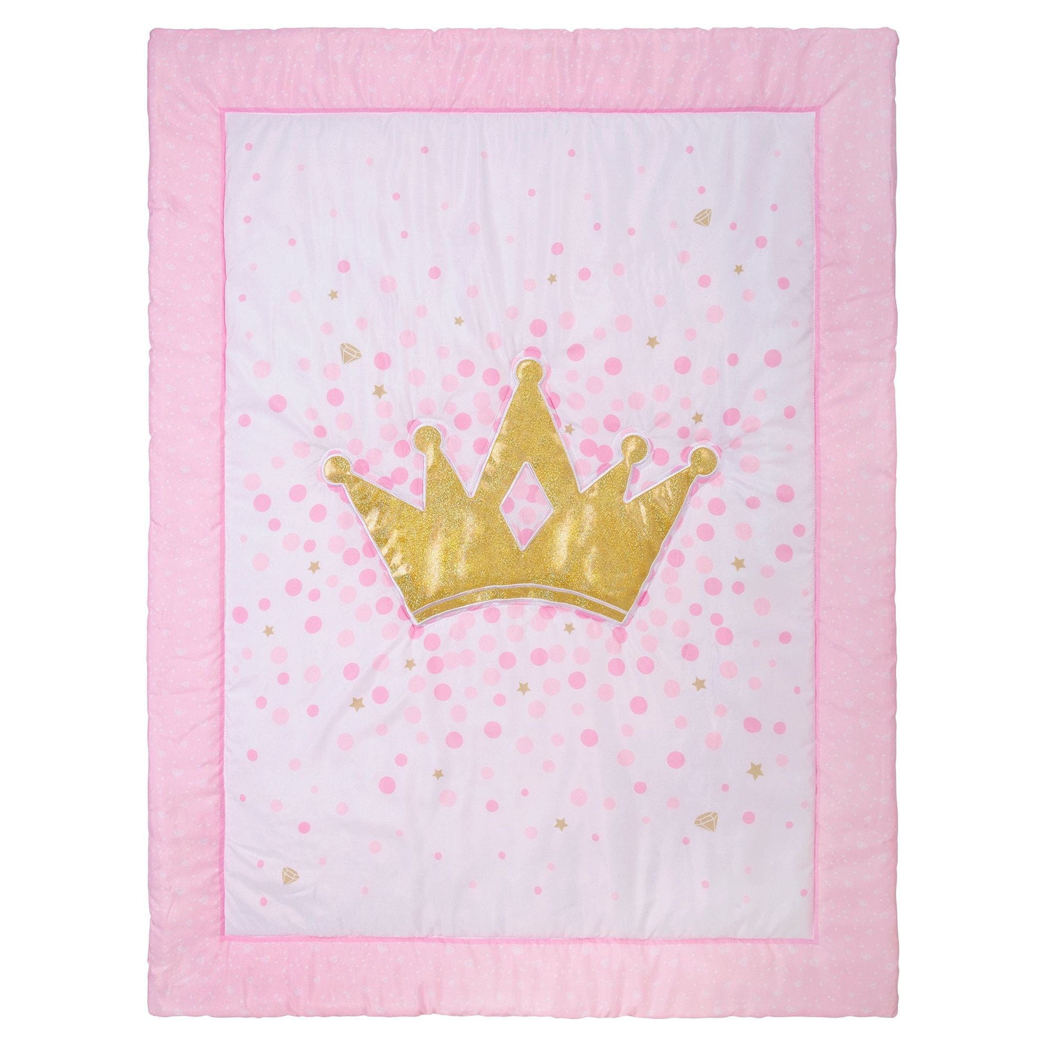 Bestow some royalty into your nursery with the Tiara Princess Bedding Collection by Sammy and Lou. With gold metallic applique tiara and diamond trimming, this bedding collection will surely add a hint of aristocracy. Coordinating crib bedding and accessories by Sammy and Lou are available sold separately. Please adhere to JPMA’s Safe Infant Bedding Practices. Set includes: Nursery Quilt measures 35 in x 45 in. The reversible quilt is a great 2-in-1 option to change the look of your nursery and can be used as a playmat for tummy time. Crib Sheet fits standard crib mattress 28 in x 52 in with # inch deep pockets and is fully elasticized for a secure fit. Crib sheet features gold crowns, diamonds and stars. Crib skirt fits standard crib mattress 28 in x 52 in with 14 inch drop and features a pink to white gradient. Plush Toy is pink unicorn with a gold crown and is made of soft plush pink fabric. Measures 9 inches tall. Fabrics & Trims: 100% Polyester Care Instructions: Machine wash cold with like colors, gentle cycle. Do not bleach. Tumble dry low or line dry. Do not iron. Do not dry clean.