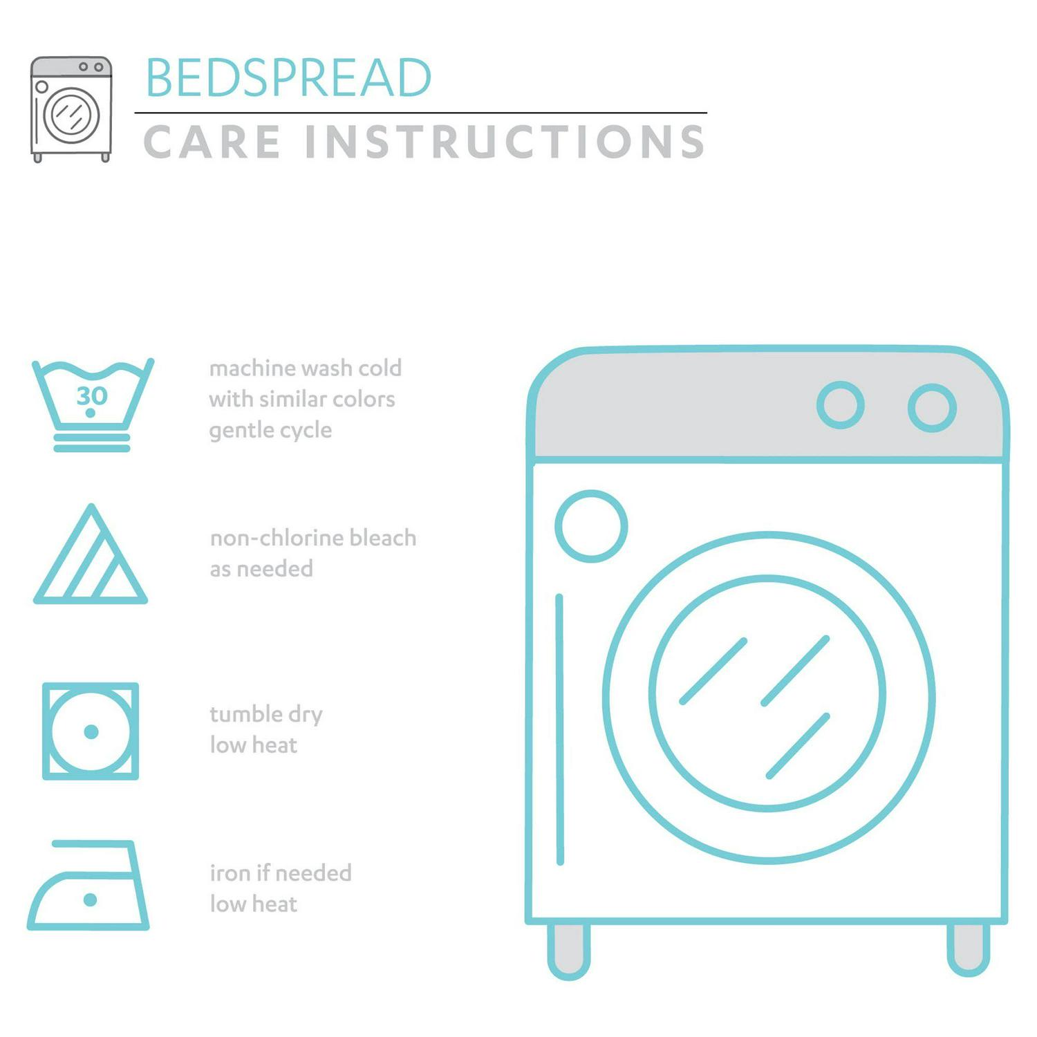 - King bedspread set includes: 1 bedspread (80″H x 76″W 30 drop) and 2 pillow shams (20 H x 36 W + 2 ruffle)