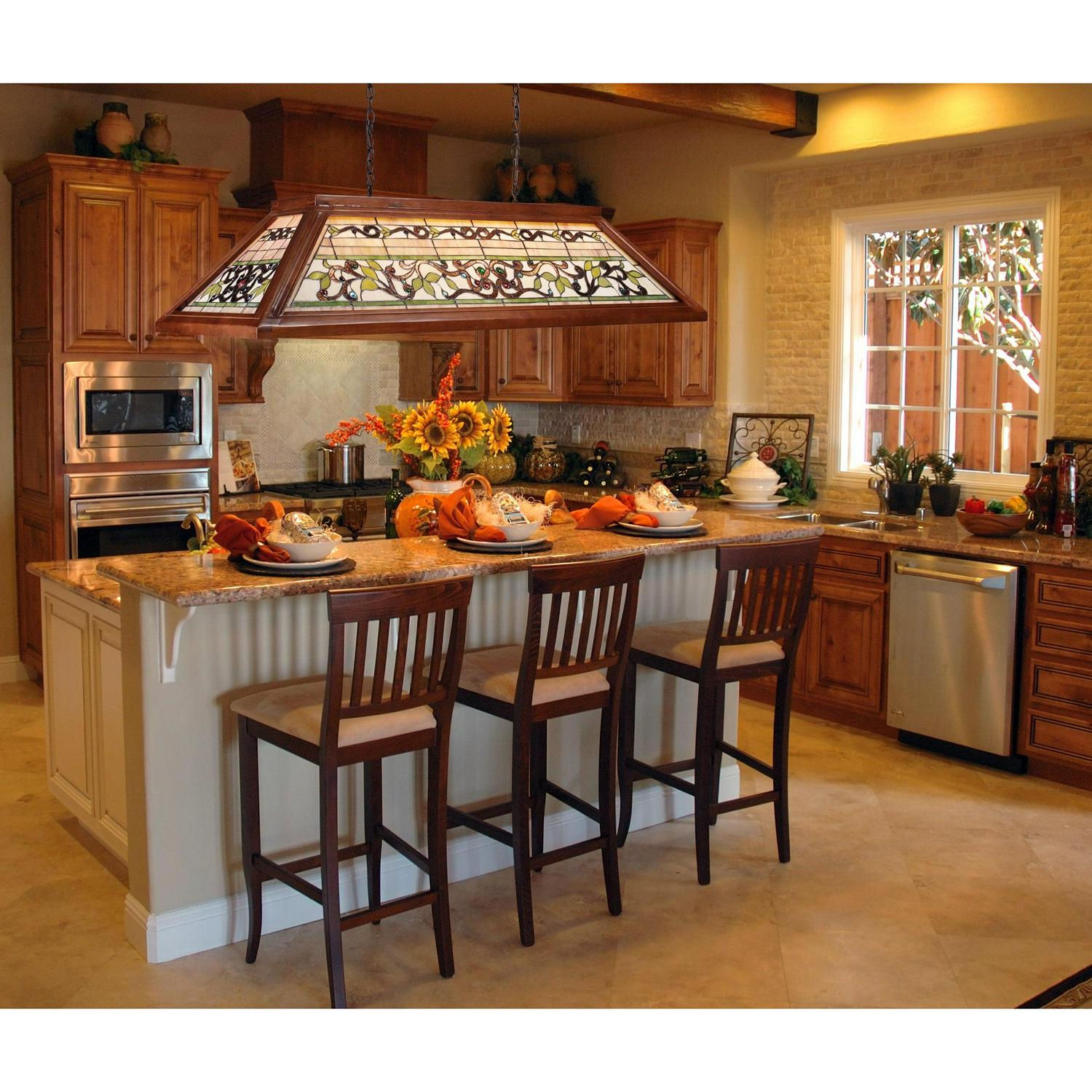 Victorian-era decorative glass windows were the inspiration behind our delightful Buckingham series lighting fixtures. A Tiffany-inspired stained-glass shade depicts lush summer foliage abloom with ripe red berries. Antiqued hardware emulates the gathered-crown braids of 19th century parlor treatments.