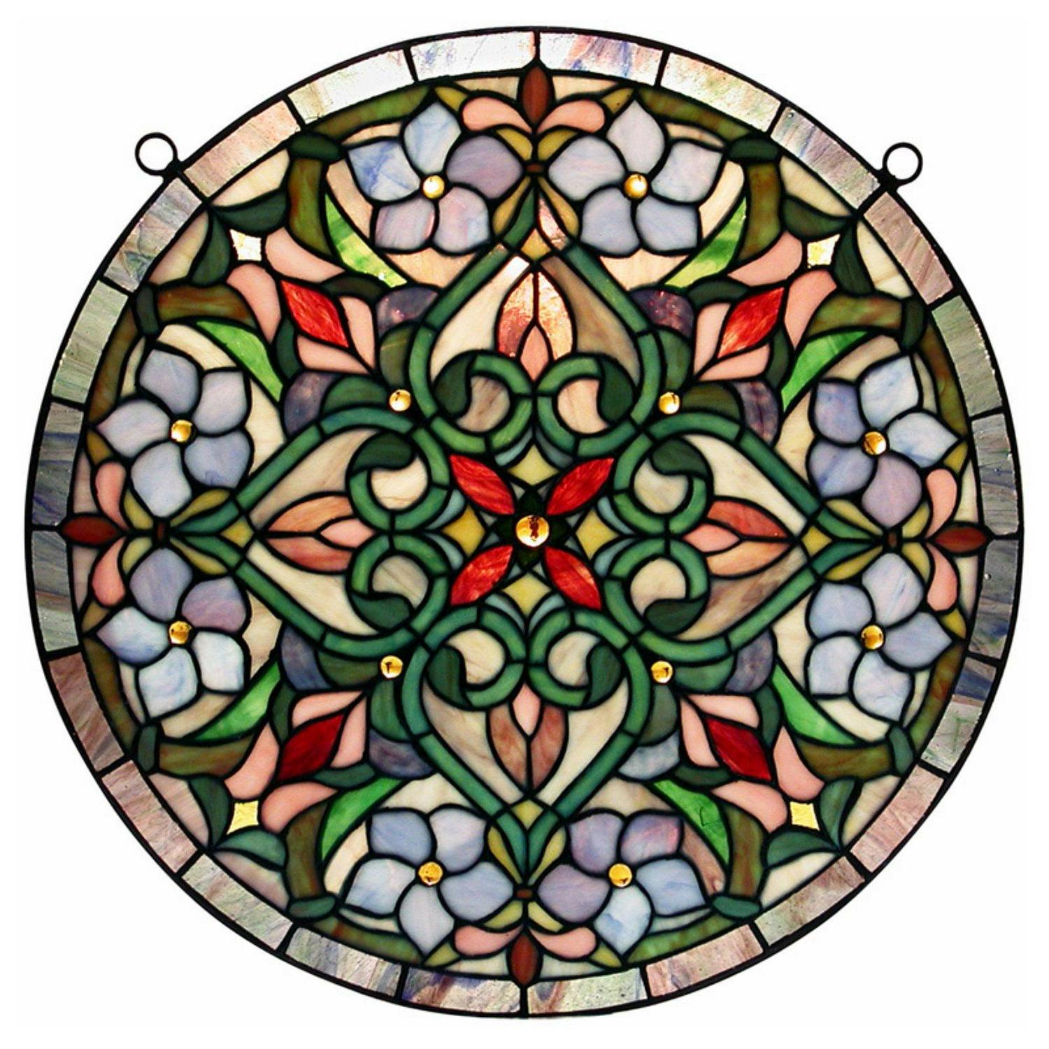 Featuring splendid colors and a beautifully balanced shape, this luxurious Tiffany stained glass window hanging allows you to enjoy the beauty stained glass provides without replacing your windows. Hanging hardware is included for your convenience.Add light like never before to your home decor with a Tiffany Lamp, a name trusted and admired in lighting and decorating design. Measure 20-inches in diameter 348-glass count and 13 cabochons Primary colors are blues, reds and greens Hanging hardware included Attention California residents: This product may contain lead, a chemical known to the State of California to cause cancer and birth defects or other reproductive harm.CSA Listed, ETL Listed, UL Listed