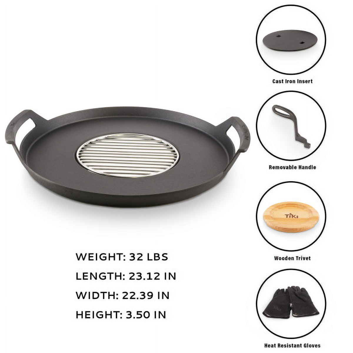 Pre-seasoned and ready for cooking right out of the box Includes outer griddle, inner griddle with a removeable handle, grill grate, wooden trivet, and leather gloves Enjoy a flexible cooking surface to grill a variety of foods Compatible with most 16″-21″ smokeless fire pits Cast iron material allows for high heat tolerance and retention when cooking