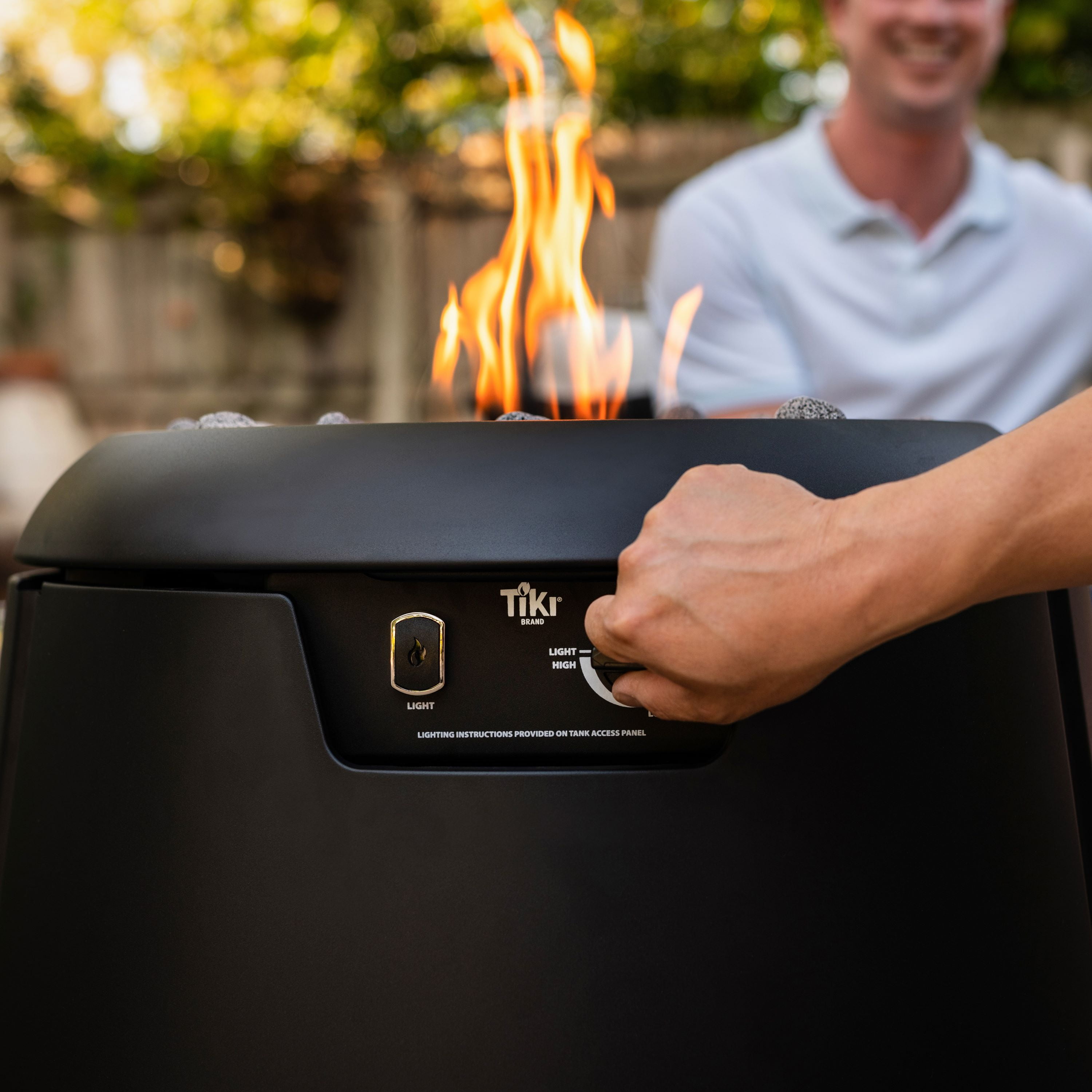 The new TIKI® Brand Customizable Propane Fire Pit features a durable design built with weatherproof materials Includes built-in propane gauge and slide out tank tray for easy access Modular design, the TIKI® Propane Fire Pit offers interlocking attachments that convert it into a stylish fire table for dining or a patio heater, sold separately.