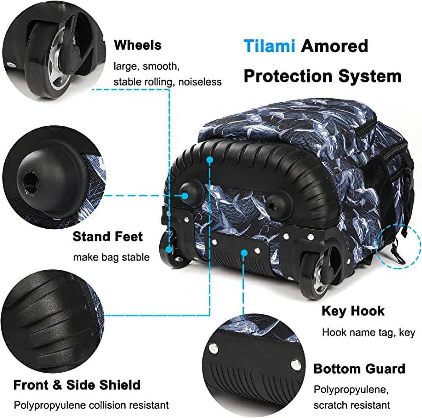 Tilami wheeled backpack dynamic design kid’s backpack with wheels, made of high-quality quality durable materials. Equipped with reflective strips for safety, this versatile rolling pack can be carried or rolled with a sturdy aluminum handle. Durable and strong fabrics and materials this rolling backpack for kids has an armored protection system that includes kickstands to stabilize the pack, large, smooth rolling wheels, key hooks for name tags or keys, scratch-resistant bottom guards, and crash-resistant front and rear guards. Multifunctional storage space Our Tilami school backpack has multiple compartments to organize your books, stationery, and gym bag and is also perfect for taking away on vacation. The mesh side pockets are also great for storing smaller items like juice or water bottles. Relieve shoulder stress adjustable shoulder straps allow you to adjust this pack to fit your child’s body, and the soft padding also helps reduce weight on your child’s shoulders and back. Wheel covers keep your clothes clean as you wear them. Unisex rolling backpack with wheels this rolling backpack is a revolutionary wheeled bag designed for school use that is sturdy, ergonomic, and practical. Your child can either carry this bag on their back or roll using the retractable built-in handle.