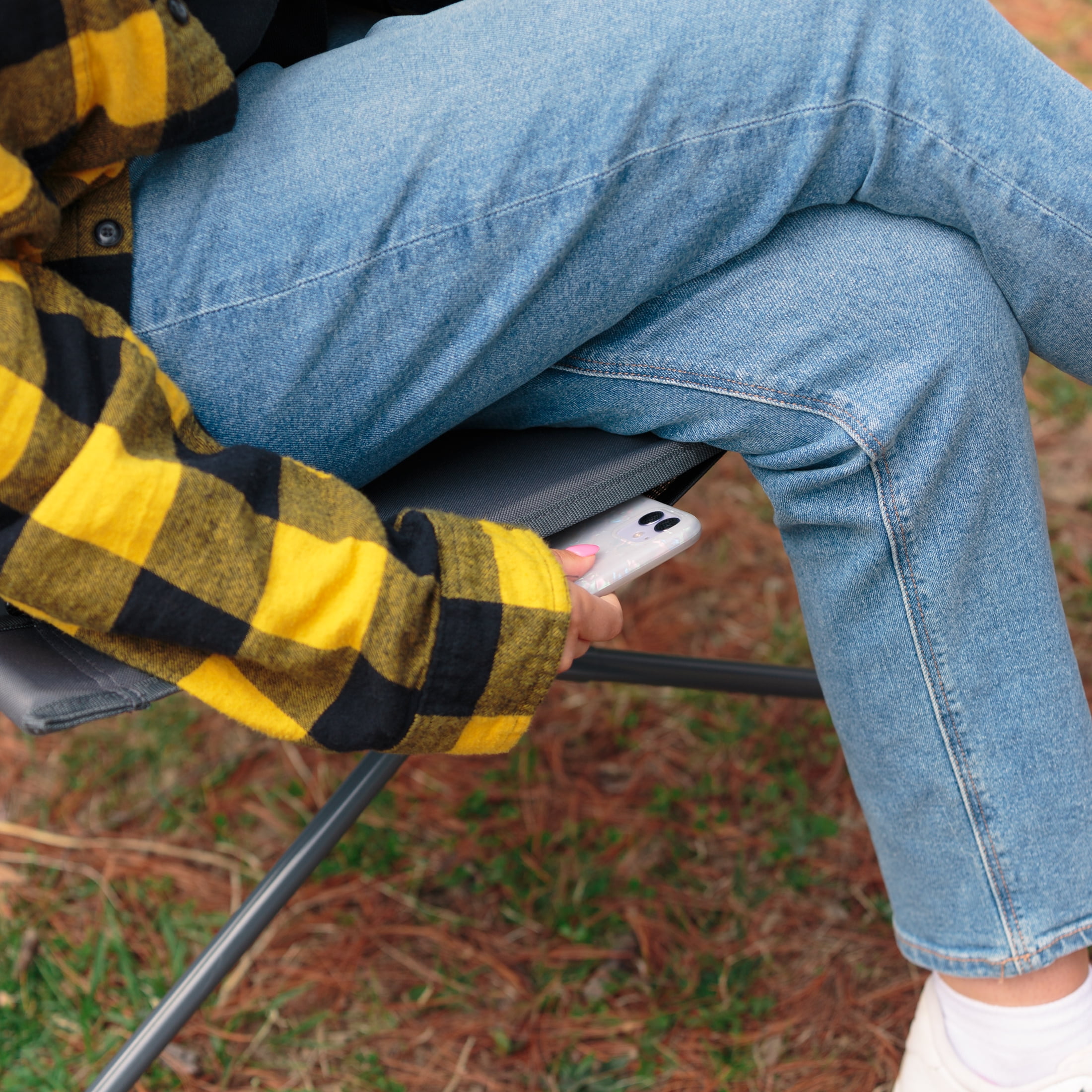 Made with durable 600D polyester fabric Designed with wide seating for comfortable stability Steel frame with powder coating for added durability Mesh phone pocket under seat keeps your device nearby Side storage pocket for other important items Mesh cup holder in armrest keeps a drink within reach Carry bag included for easy transportation and storage Product Dimensions (inches): 22.8” x 16.1” x 20.5” x 37” Weight capacity (pounds): 300 lbs.