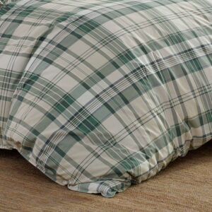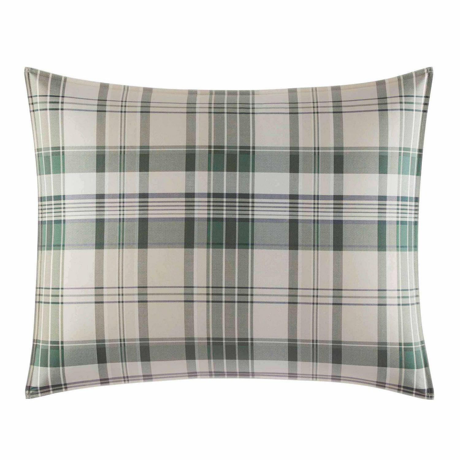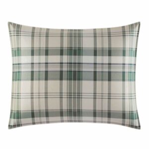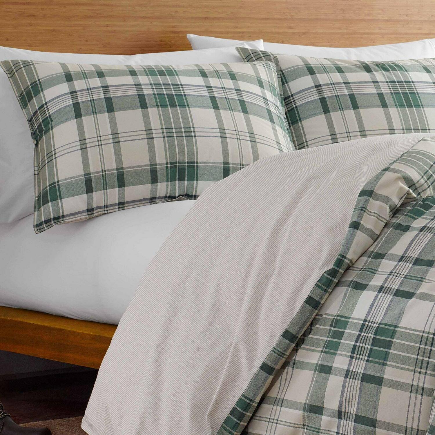A boldly scaled plaid in shades of forest green and pale khaki on white creates a warm and welcoming atmosphere as soon as you walk into the room. Reminiscent of your favorite weekend wear, this handsome plaid and shirting stripe reverse will help you relax and unwind after a long day of work or play as you get comfortable in its soft cotton embrace.