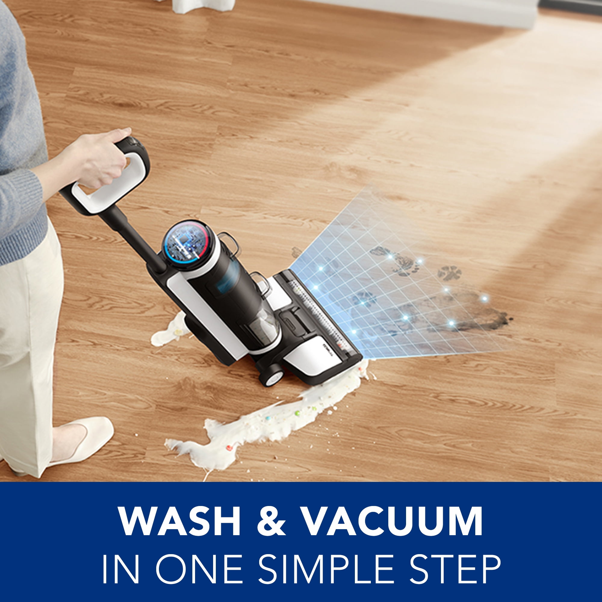 FLOOR ONE S3 is a smart floor washer that saves you time by combining two chores – vacuuming and mopping – in one step, leaving floors clean and streak-free. Featuring iLoop™ Smart Sensor Technology, FLOOR ONE S3 senses dirt and debris, then auto controls suction and water flow, leaving floors shiny and clean. iLoop™ helps optimize battery life to up to 35 minutes for cordless floor cleaning anywhere. Other smart features include a full-color LED screen that helps you monitor iLoop’s automatic cleaning power, app connectivity, and a helpful voice assistant. Pick up messy, sticky spills and pet hair on all sealed hard floors like hardwood, tile, laminate, vinyl, marble, and linoleum. Its dual tank technology guarantees that you’re always cleaning with fresh water, not just pushing around dirty water like a traditional mop. Once you’re done cleaning, place FLOOR ONE S3 in the charging base and press the self-clean button. It will run a self-cleaning cycle to clean the roller brush and the internal tubes, all without having to touch a dirty roller brush.