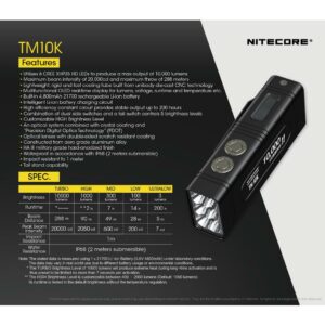 Dimensions: 4.33″ x 1.22″ x 1.61″. Rechargeable. Water resistant. Impact resistant. Tailcap switch. Clip. Lanyard. Six CREE XHP35 HD LEDs. Modes: Turbo (10000 lumens), High (1000 lumens, 2h runtime), Mid (300 lumens, 7h runtime), Low (100 lumens, 14h runtime), Ultralow (3 lumens, 200h runtime). 288m beam distance. Multifunctional OLED real time display for lumens, voltage, runtime, and temperature. Tail stand capability. Optical lenses with double-sided scratch resistant coating. Dual side switches. Two lockout modes. Requires (1) Lithium battery (included). Black nylon pouch. Aluminum construction. Color: Black. Boxed.